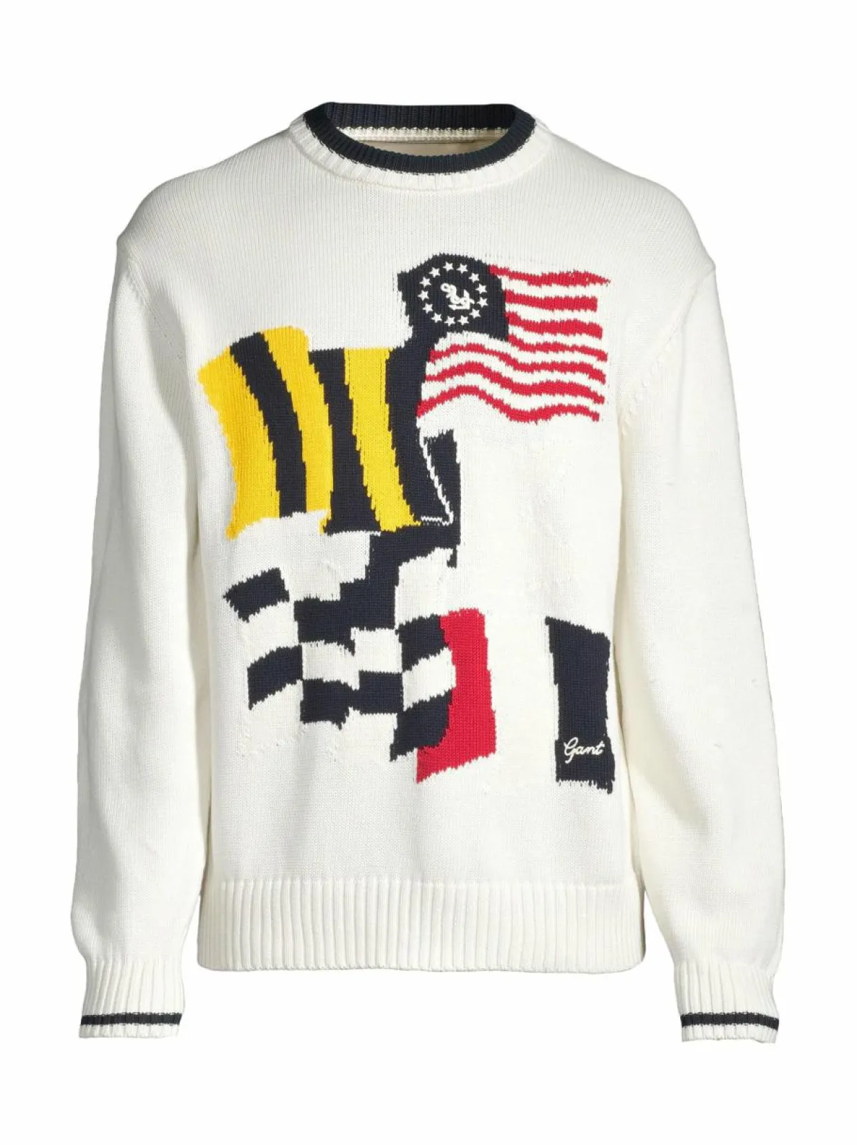 Gantin kevyehköstä puuvillasta valmistetussa Flag Intarsia C-Neck -neulepaidassa on värikäs, intarsiatekniikalla toteutettu lippukuvio vartalo-osassa. Mallissa on klassinen pyöreä pääntie sekä kontrastiväriset koristeraidat ja joustinneuletta helmassa ja hihansuissa. Vaate on mitoitukseltaan väljä.