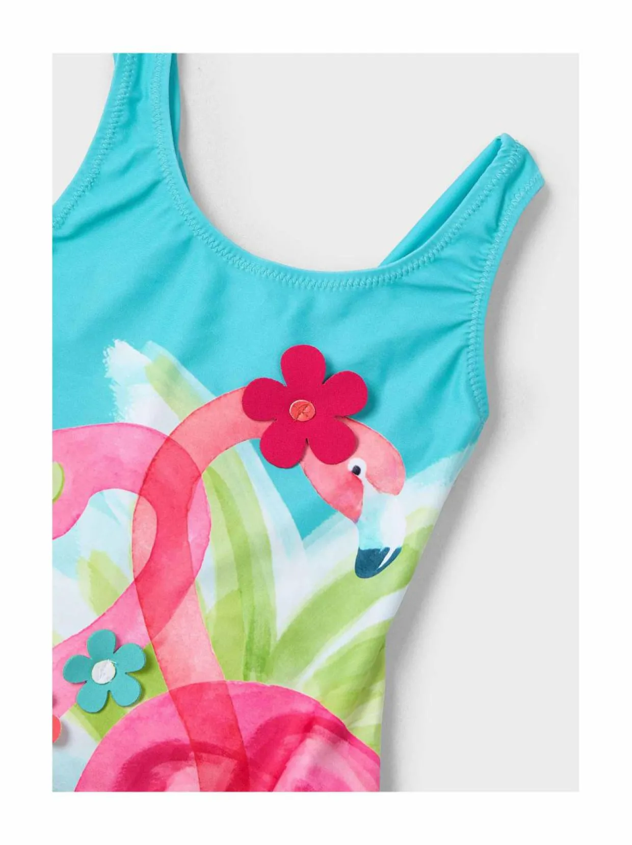 Mayoralin Flamingo Flowers -uimapuvussa on kaunis flamingo-kuvio 3D-kukkineen. Uimapuvussa on leveät, takana ristikkäin kulkevat olkaimet. Vaate on valmistettu pehmeästä ja nopeasti kuivuvasta materiaalista.