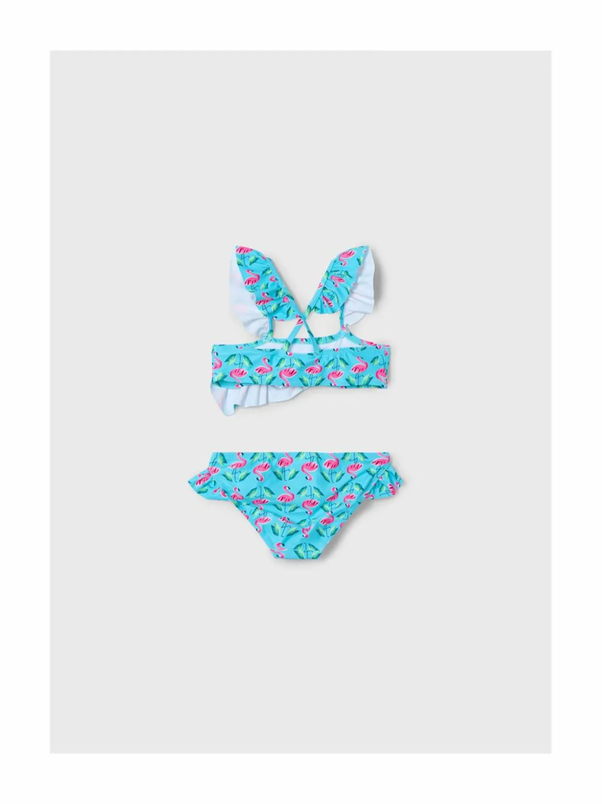Mayoralin värikkäät lasten bikinit falmingo-kuosissa. Yksityiskohtana kauniit röyhelöreunukset. Kaksiosainen bikinisetti on valmistettu pehmeästä, joustavasta ja nopeasti kuivuvasta materiaalista.