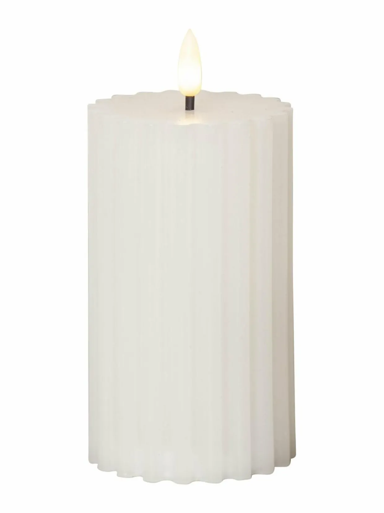 Vahasta valmistettu LED-kynttilä sisäkäyttöön. Kynttilässä on uritettu pinta ja kaunis luonnollisen näköinen liekki lämpimän valkoisella valolla.