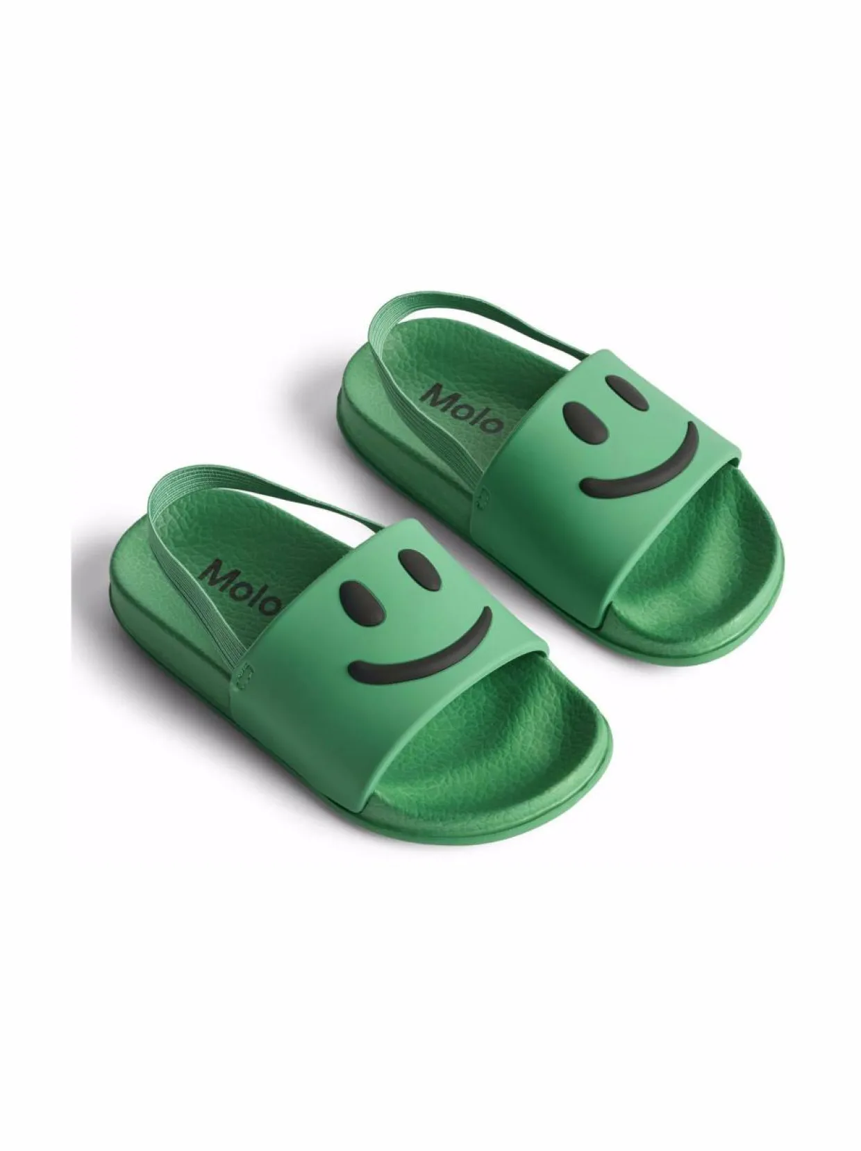 Molo-merkin Flip Flops -sandaalit ovat mukavat ja käytännölliset. Sandaaleissa on leveä ja pehmeä pohja, joka antaa hyvän tuen jalalle. Sandaalit ovat valmistettu polyvinyylikloridista, joka on kestävä ja vedenkestävä materiaali. Sandaaleissa on hymynaama-kuvio, joka luo hyväntuulista ilmettä ulkoasuun kuin mieleenkin. Sandaalit ovat täydellinen valinta kesäpäiviin ja uima-altaalle.