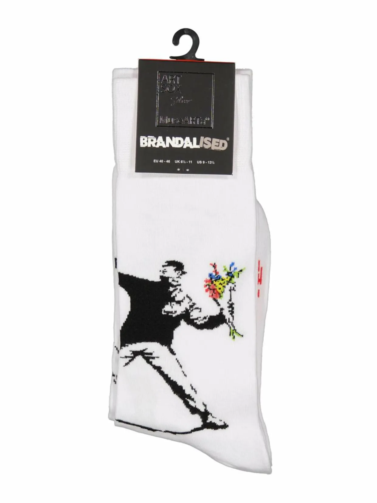 Tunnettuun, alun perin Jerusalemissa nähtyyn katutaideteokseen perustuvat sukat. Taideteos kuvastaa maskiin sonnustautunutta kukkia heittävää palestiinalaista. One size koko 40-46.
