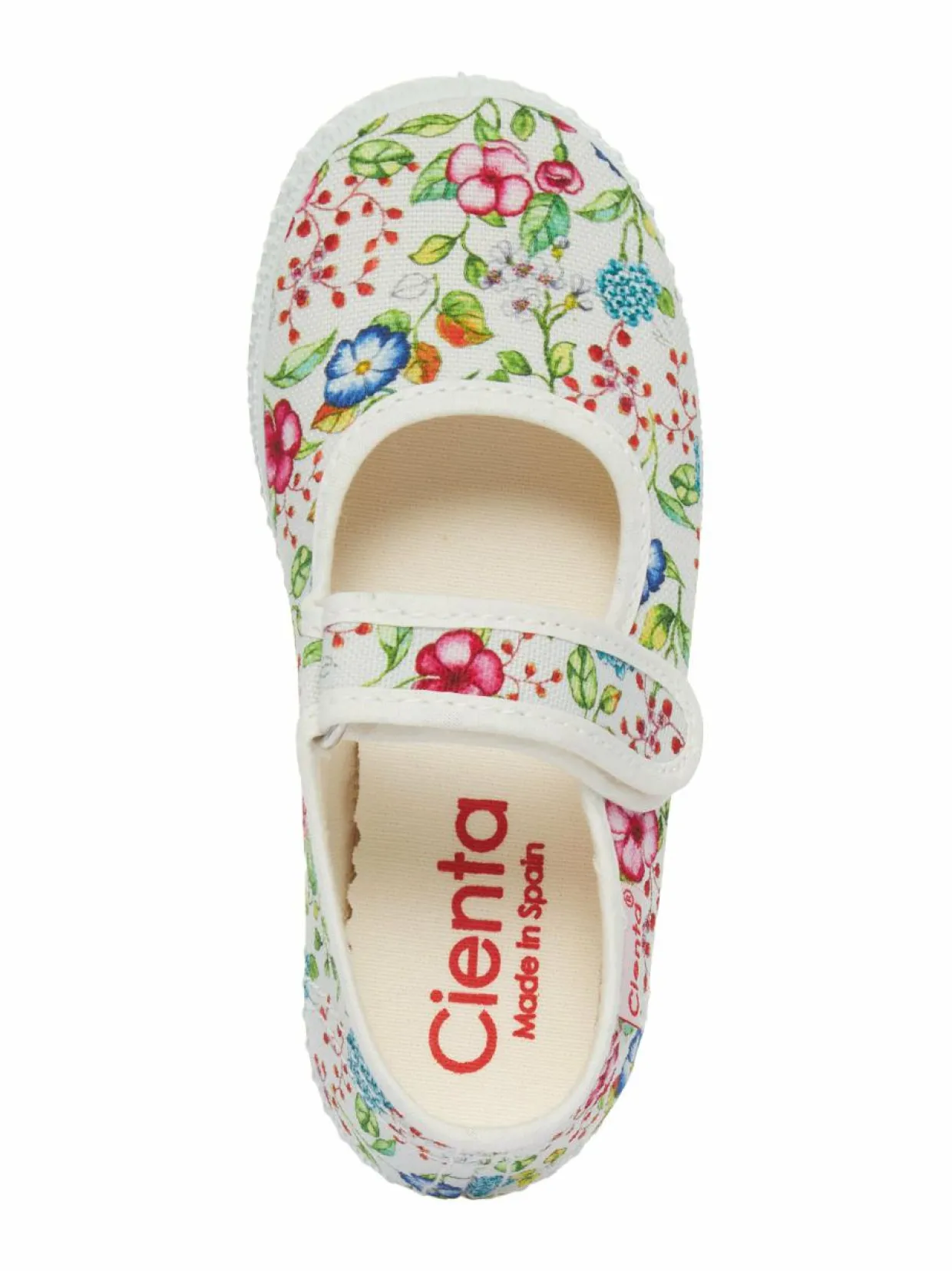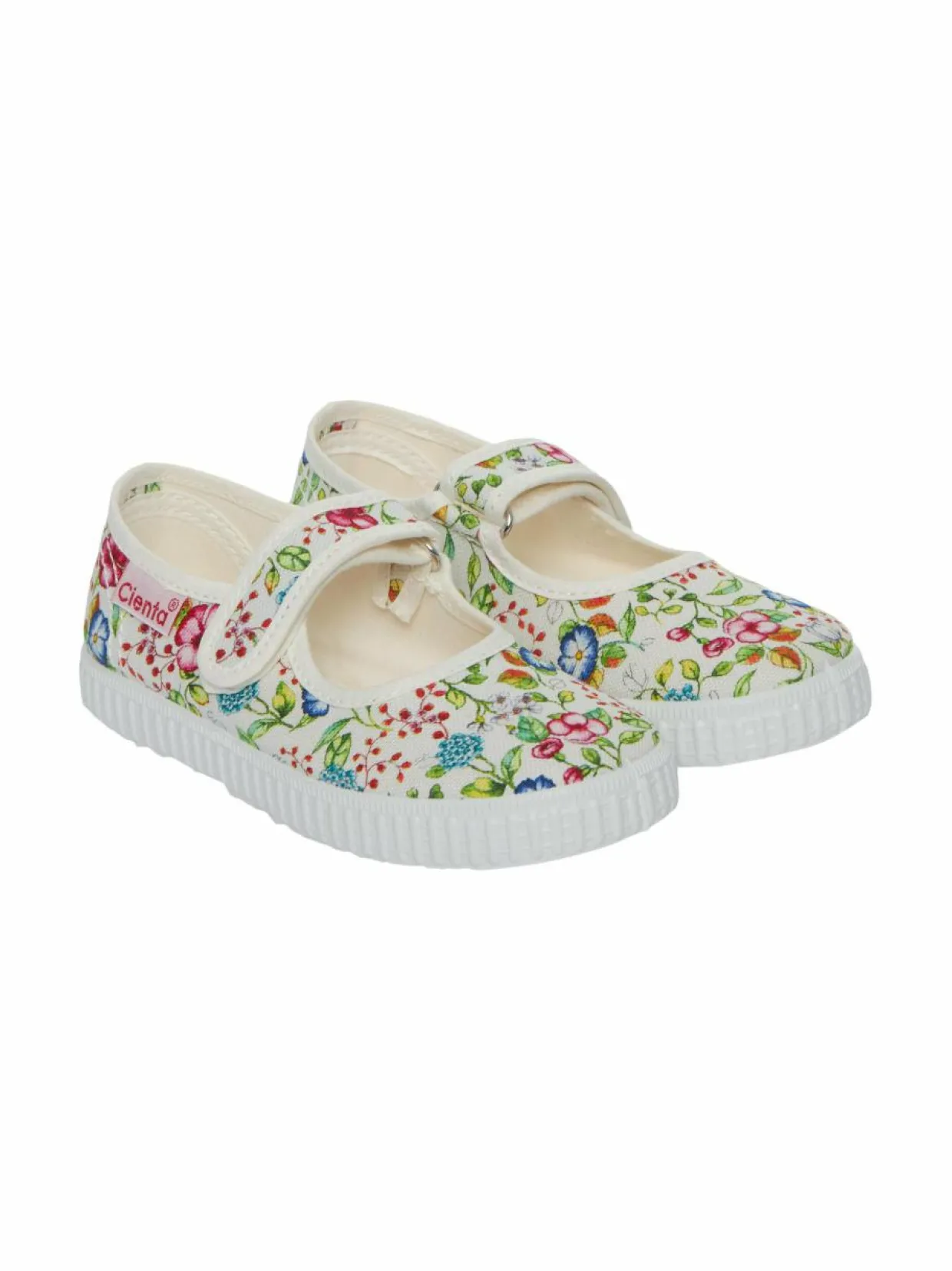 Kesäisissä Cienta-kangaskengissä on pitävä kumipohja. Kukkainen ja raikas kuosi tuo arkeenkin juhlan tuntua. Kengät ovat mukavat jalassa ja helppo pukea, sillä kengissä on kätevä tarrakiinnitys. Pohjamateriaalissa on kevyt kukkaistuoksu.