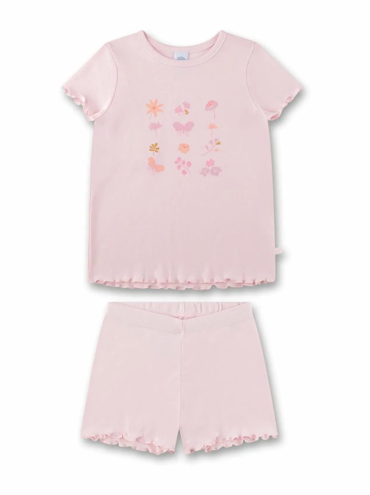 Sanetta Flower -shortsipyjama on valmistettu hengittävästä ja miellyttävän tuntuisesta puuvillasta, joka takaa iholle mukavan tunteen koko yön ajaksi. Settiin kuuluu lyhythihainen t-paita, jossa on söpö kukka- ja perhoskuviointi sekä yhteensopivat shortsit. Molemmissa osissa on aaltomaiset reunat, jotka tuovat pyjamaan hauskaa ilmettä.
