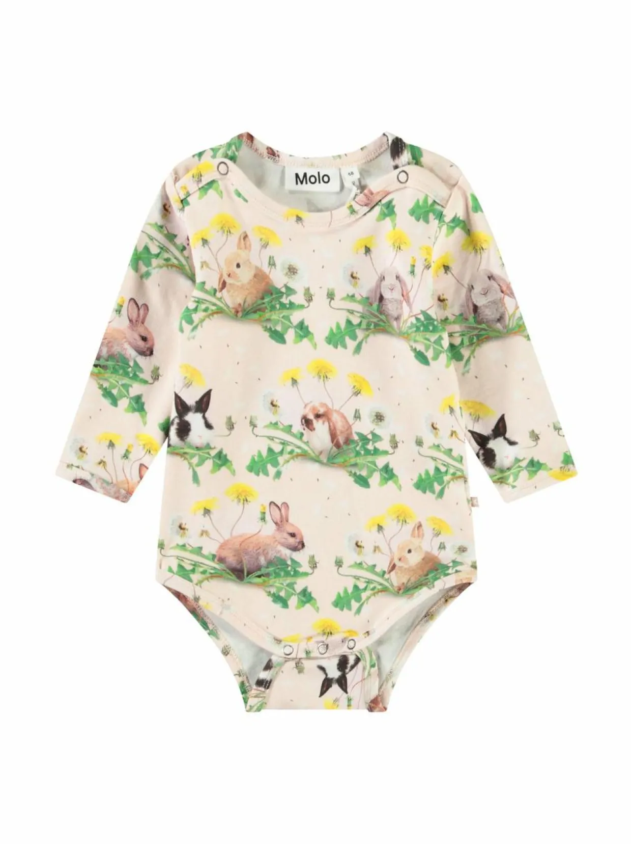 Ihastuttava Foss Bunnies -body brändiltä Molo on valmistettu pehmeästä ja joustavasta trikoosta, joka sisältää 95 % luomupuuvillaa. Bodyssa on söpöjä pupujen ja voikukkien kuvioita. Body on pitkähihainen ja siinä on nepparit olkapäillä ja haaroissa. Se on helppohoitoinen ja se voidaan pestä koneessa.