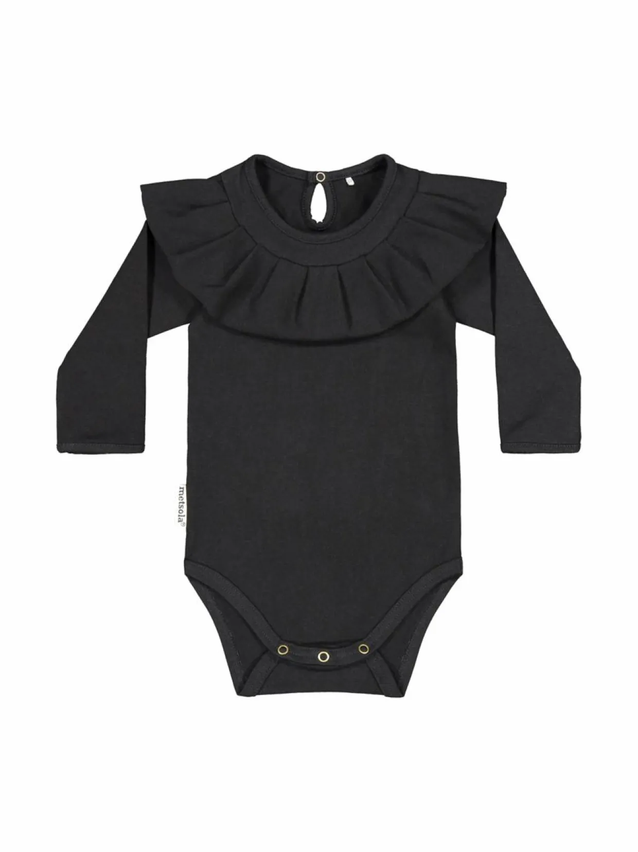 Metsolan Frilla-bodya somistaa pääntien hurmaava röyhelö. Niskassa ja haarassa on painonappikiinnitys. Body on valmistettu pehmeästä, GOTS-sertifioidusta luomupuuvillasta, johon on lisätty hieman joustavaa elastaania.