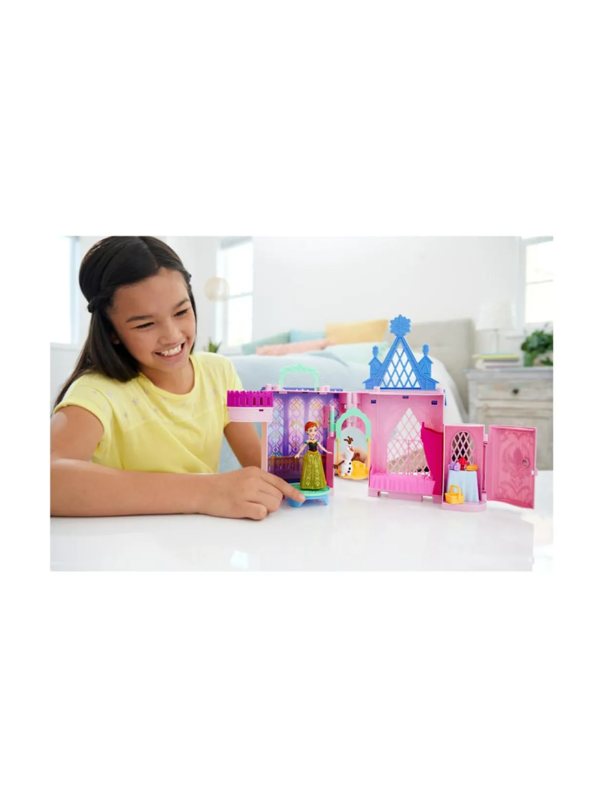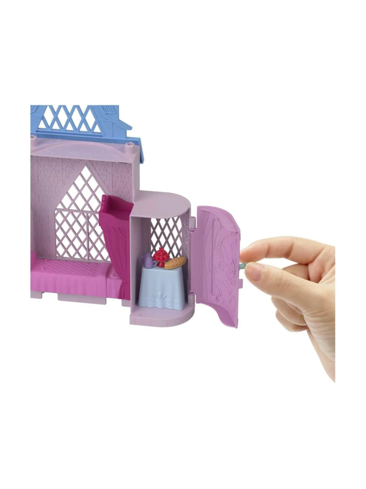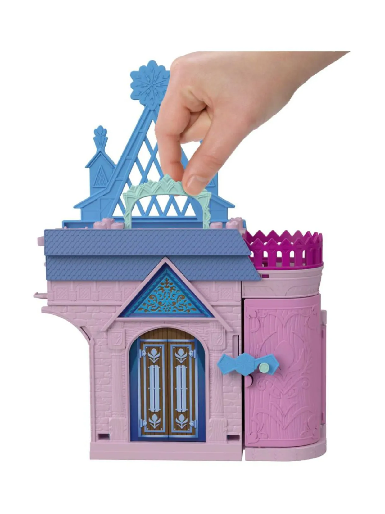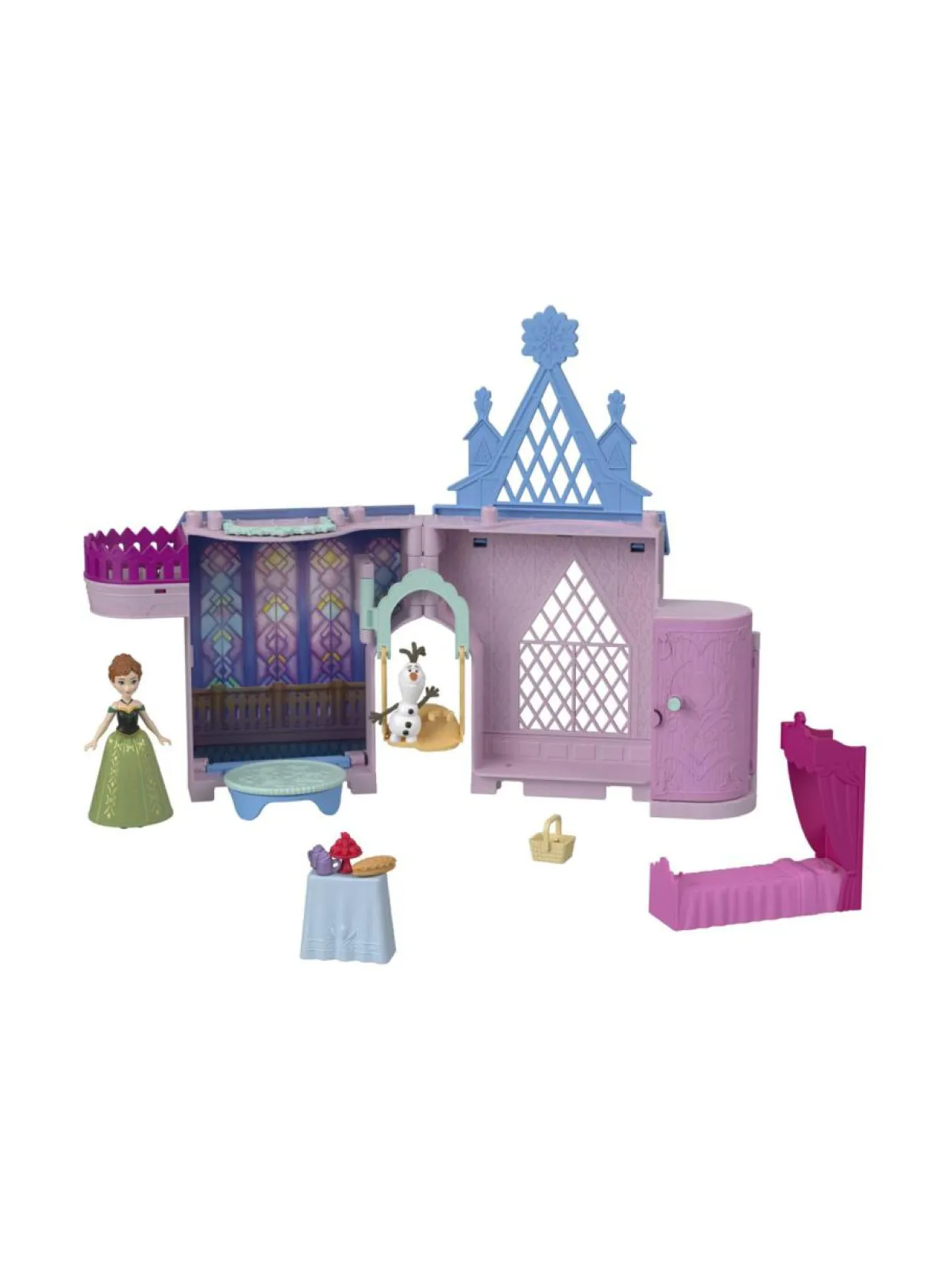 Tämä pieni linna on saanut inspiraationsa Disney Frozen -elokuvista! Annan Arendellin linnaan avautuu useita leikkipaikkoja. Lisäksi setistä löytyy Anna-nukke, Olaf-figuuri, huonekaluja ja muuta. Lelupakkauksessa on kätevä kahva, josta sitä voi kantaa mukanaan.