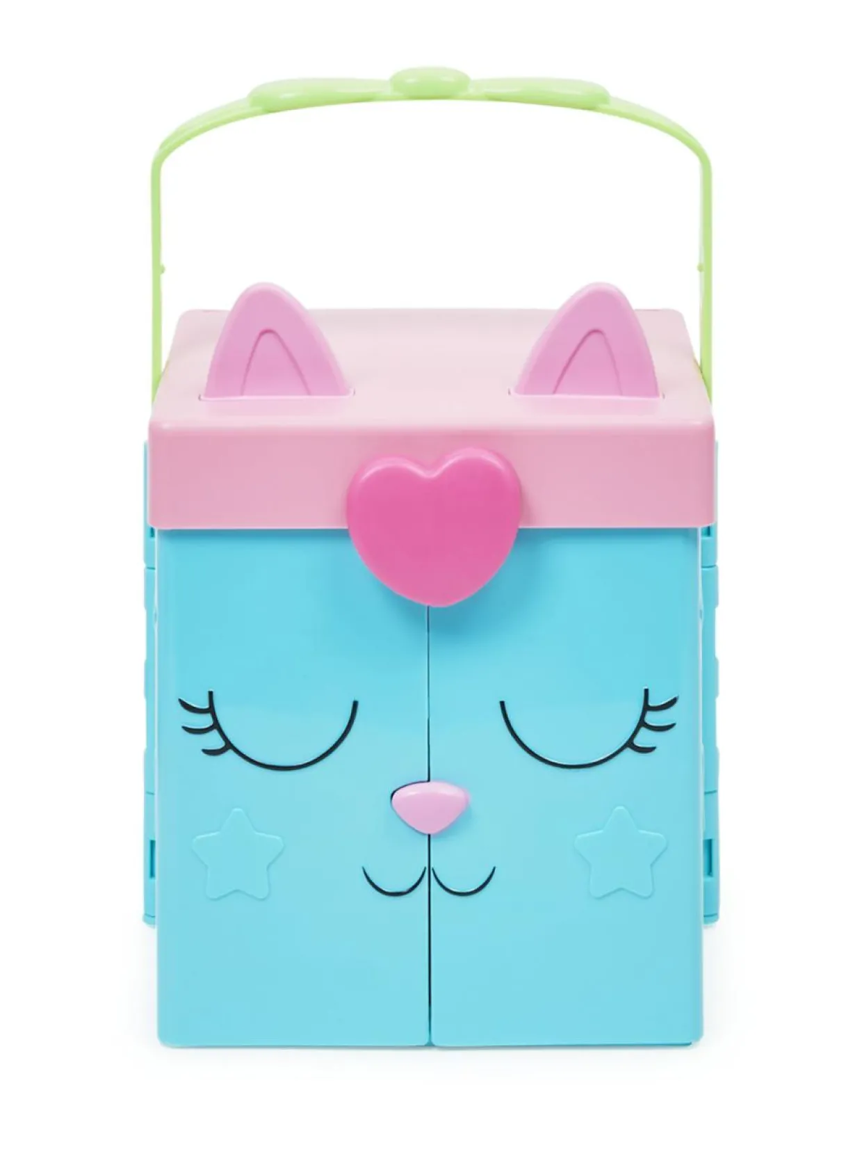 Esittelyssä Gabbyn nukketalon pukeutumishuone, joka on kannettava leikkisetti! Vaatehuone avautuu neljäksi jännittäväksi alueeksi, jotka jokainen Netflixin menestyssarjan fani ehdottomasti tarvitsee! Suuntaa kampauspöydän ja peilin luo, jossa on kolme tyylikästä peruukkia ja kaksi peruukkitelinettä, niin voit tehdä Gabbylle kampauksen ja meikin! Mene sen jälkeen vaatehuoneeseen, jossa on kolme seinään kiinnitettyä ripustinta ja laatikot vaatteiden säilyttämistä varten sekä kaksi erilaista asua, joista Gabby voi valita suosikkinsa! Kun Gabby on valinnut asunsa, hyppää pyörivälle korokkeelle ja työnnä Gabbya edestakaisin lavalla pyörittääksesi häntä ympäri! Älä unohda avata Nukketalopakettia, aivan kuten Gabby tekee sarjassa! Löydät Nukketalopaketista hienon yllätysasusteen. Kun Gabby on valmis, kiipeä muovisia köysitikkaita pitkin ylös valokuvausstudioon, jossa voit valita 4:stä eri taustakuvasta suosikkisi valokuvaussessiota varten.