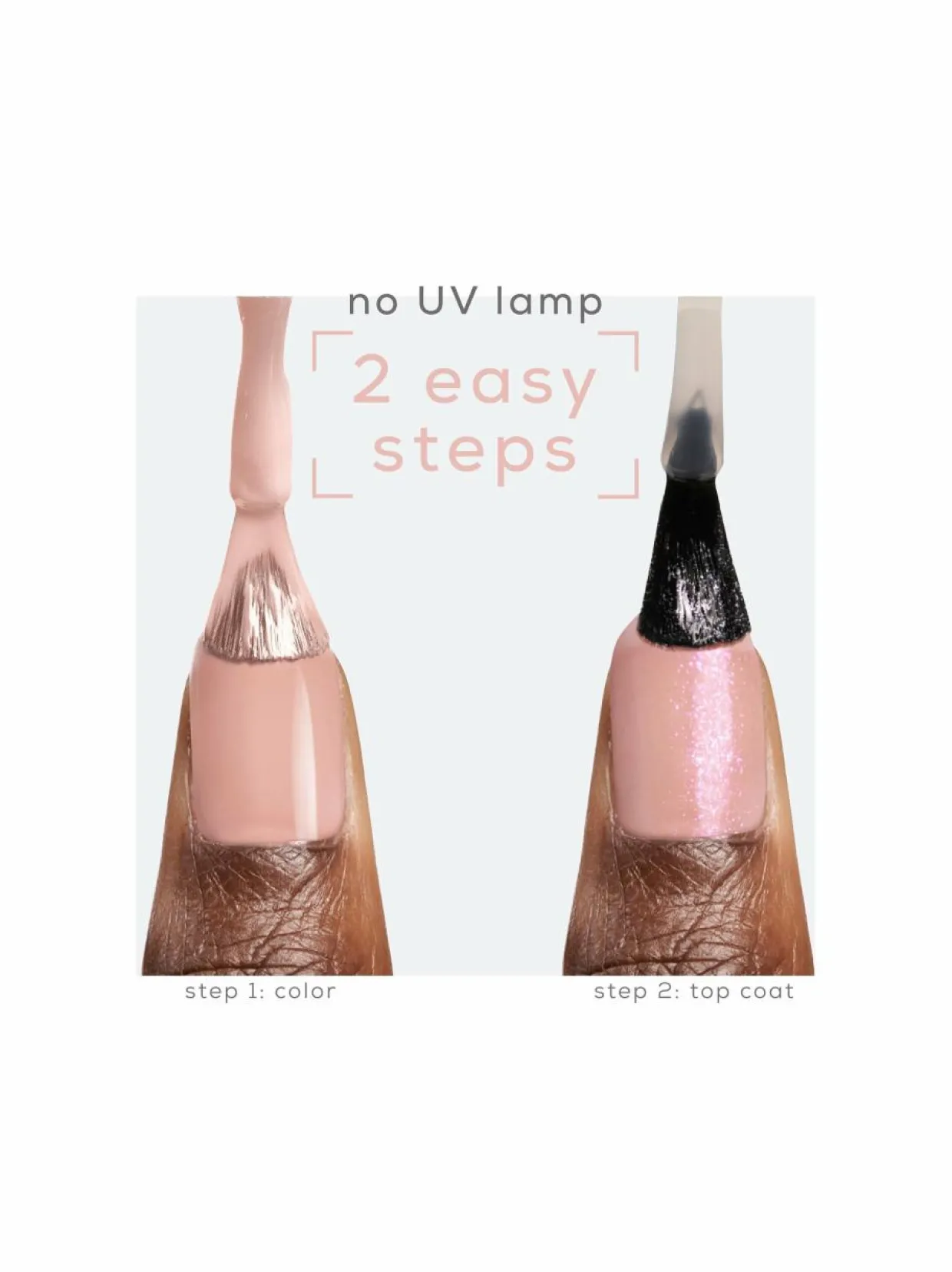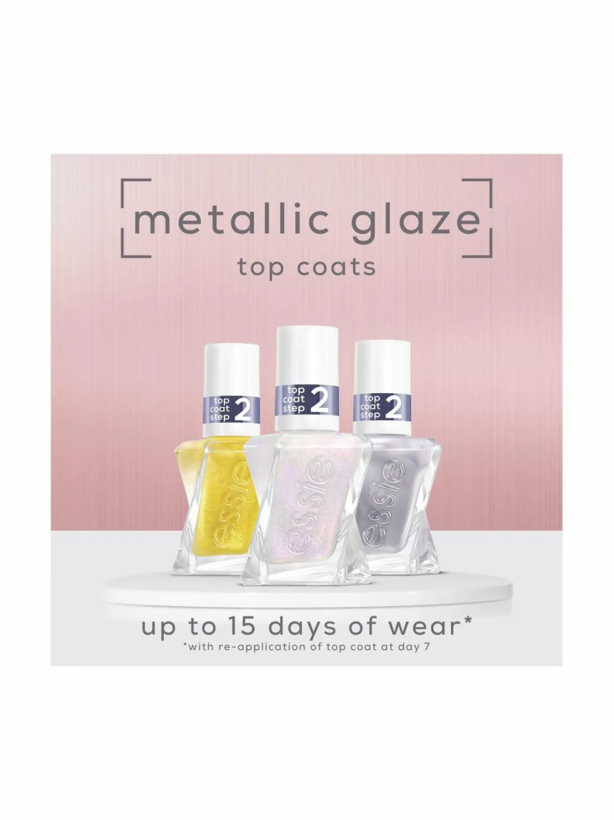 Anna geelilakallesi metallinhohtoinen lopputulos vain yhdellä pyyhkäisyllä. Metallihelmet päällyslakan koostumuksessa taittavat valoa ja moninkertaistavat heijastuksen 360 asteen kulmassa ja antavat erittäin kiiltävän lopputuloksen. Käytä yhdessä essie gel couture – kynsilakan kanssa ja luo upeita kynsitrendejä kotona, esimerkiksi ”vanilla chrome” ja ”glazed donut” kynnet. Kaksivaiheinen manikyyri kestää jopa 15 päivää*. Et tarvitse UV-lamppua. Levitä uusi kerros päällyslakkaa 7 päivän kuluttua. Ihana metallin- ja helmiäisenhohtoinen päällyslakka antaa mille tahansa kynsilakalle kromiefektin.