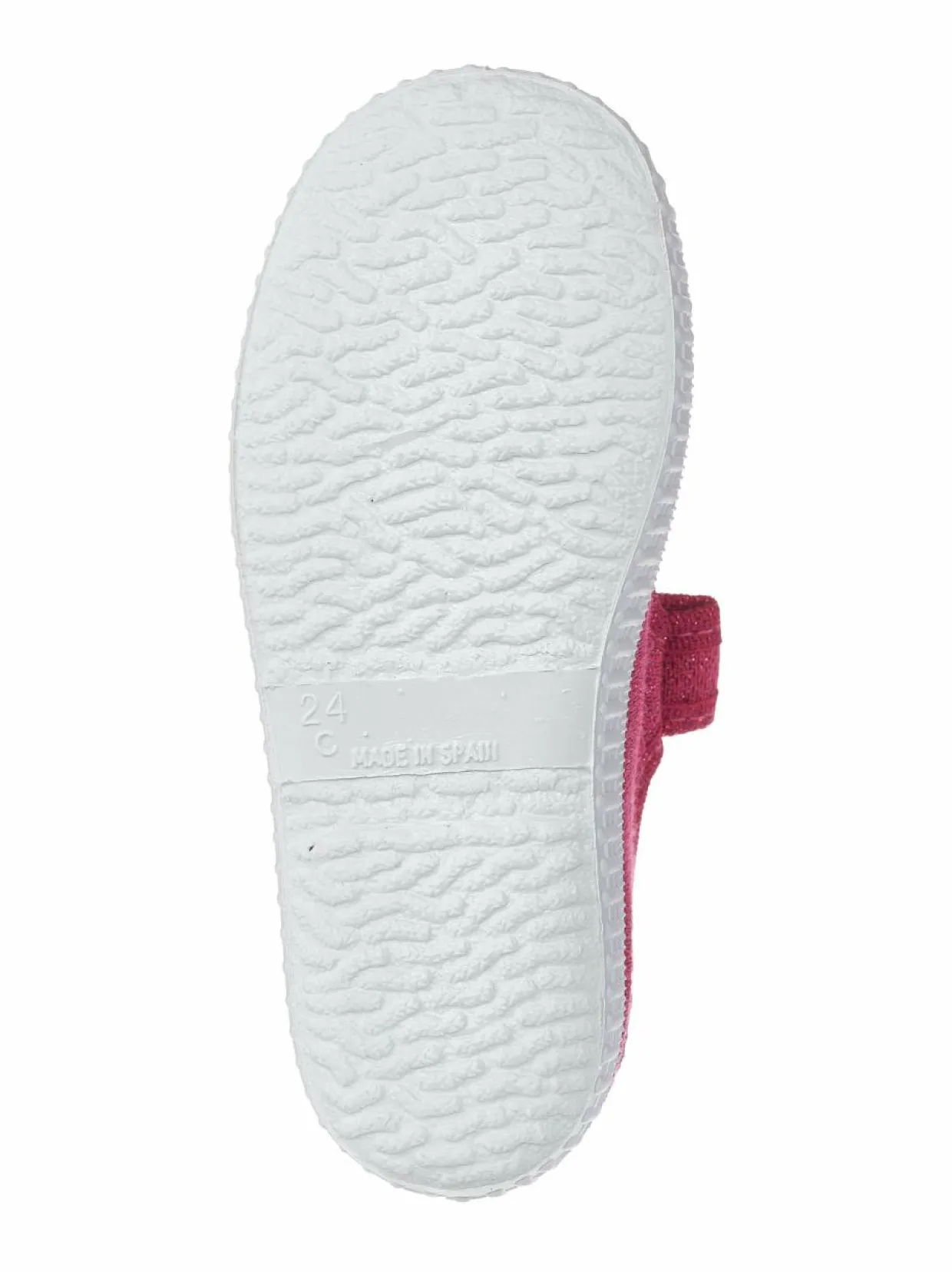 Kesäisissä Cienta-kangaskengissä on pitävä kumipohja. Kimaltava glitter-väri tuo arkeenkin juhlan tuntua. Kengät ovat mukavat jalassa ja helppo pukea, sillä kengissä on kätevä tarrakiinnitys. Pohjamateriaalissa on kevyt kukkaistuoksu.