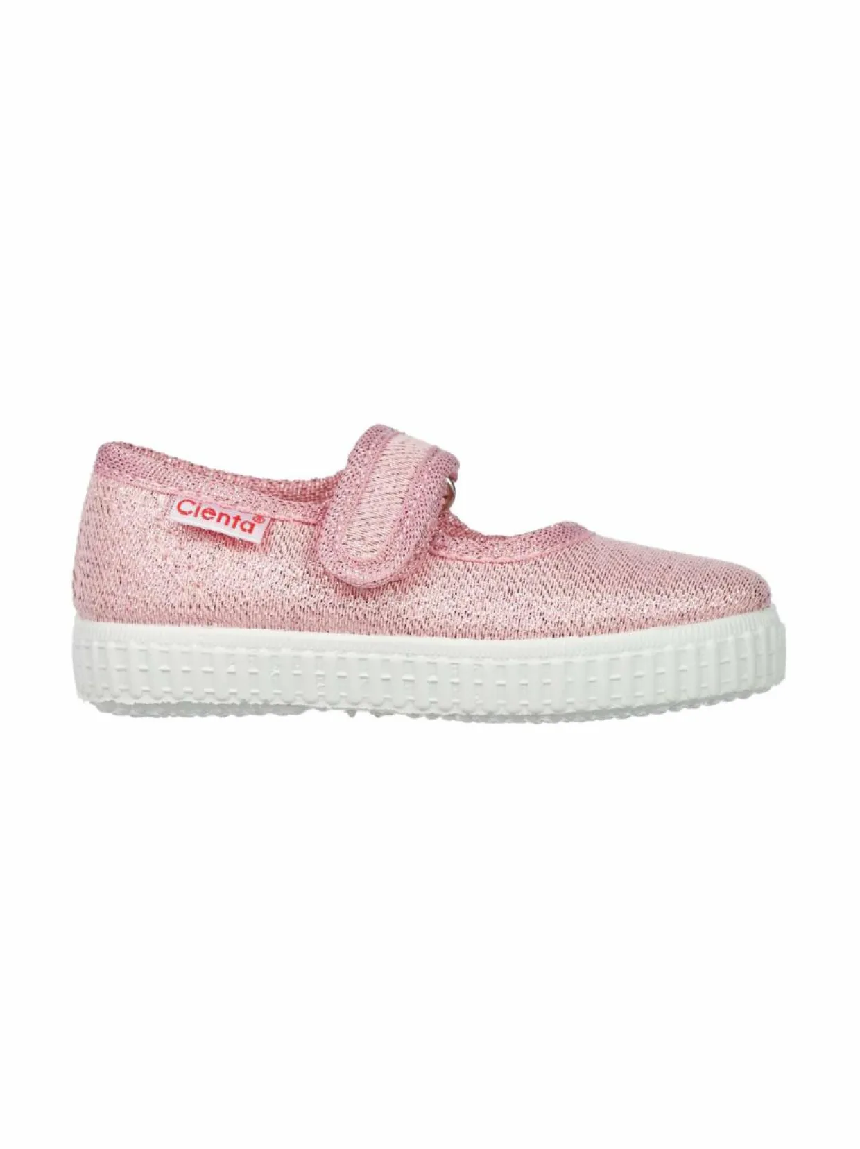 Kesäisissä Cienta-kangaskengissä on pitävä kumipohja. Kimaltava glitter-väri tuo arkeenkin juhlan tuntua. Kengät ovat mukavat jalassa ja helppo pukea, sillä kengissä on kätevä tarrakiinnitys. Pohjamateriaalissa on kevyt kukkaistuoksu.