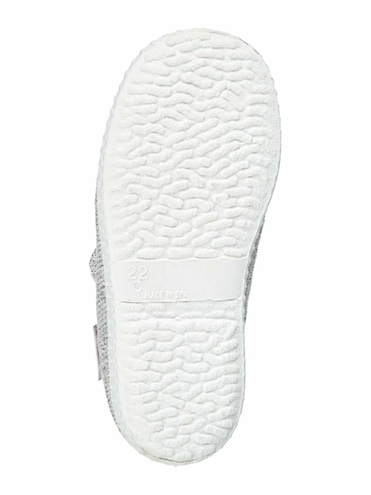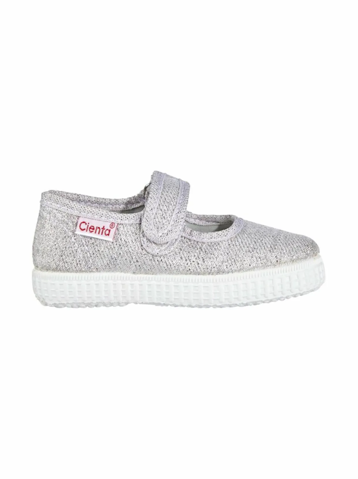 Kesäisissä Cienta-kangaskengissä on pitävä kumipohja. Kimaltava glitter-väri tuo arkeenkin juhlan tuntua. Kengät ovat mukavat jalassa ja helppo pukea, sillä kengissä on kätevä tarrakiinnitys. Pohjamateriaalissa on kevyt kukkaistuoksu.