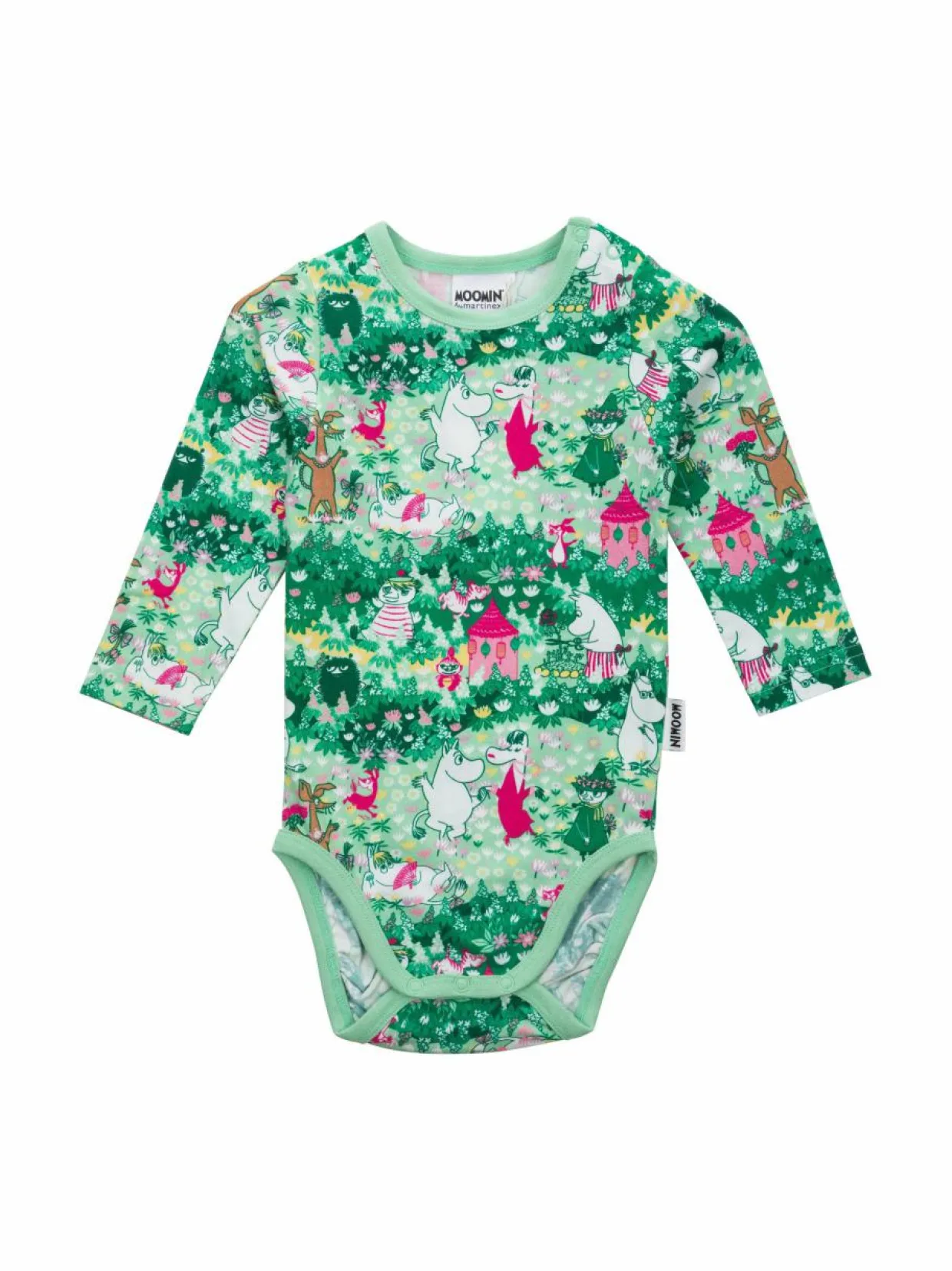 Muumien pehmeä ja mukava Greenery-body vauvoille. Mallissa on pitkät hihat sekä nepparit olkapäillä ja haarassa. Lisäksi siinä on ylimääräistä tilaa vaipalle. Bodyssa on hauska kuvio täynnä muumihahmoja ja kukkia. Joustava ja miellyttävä materiaali on 95 % puuvillaa ja 5 % elastaania.