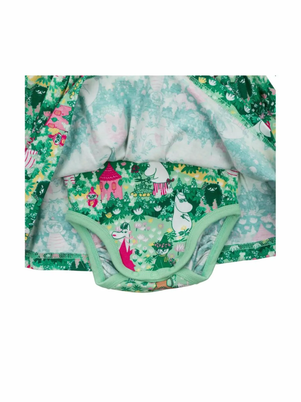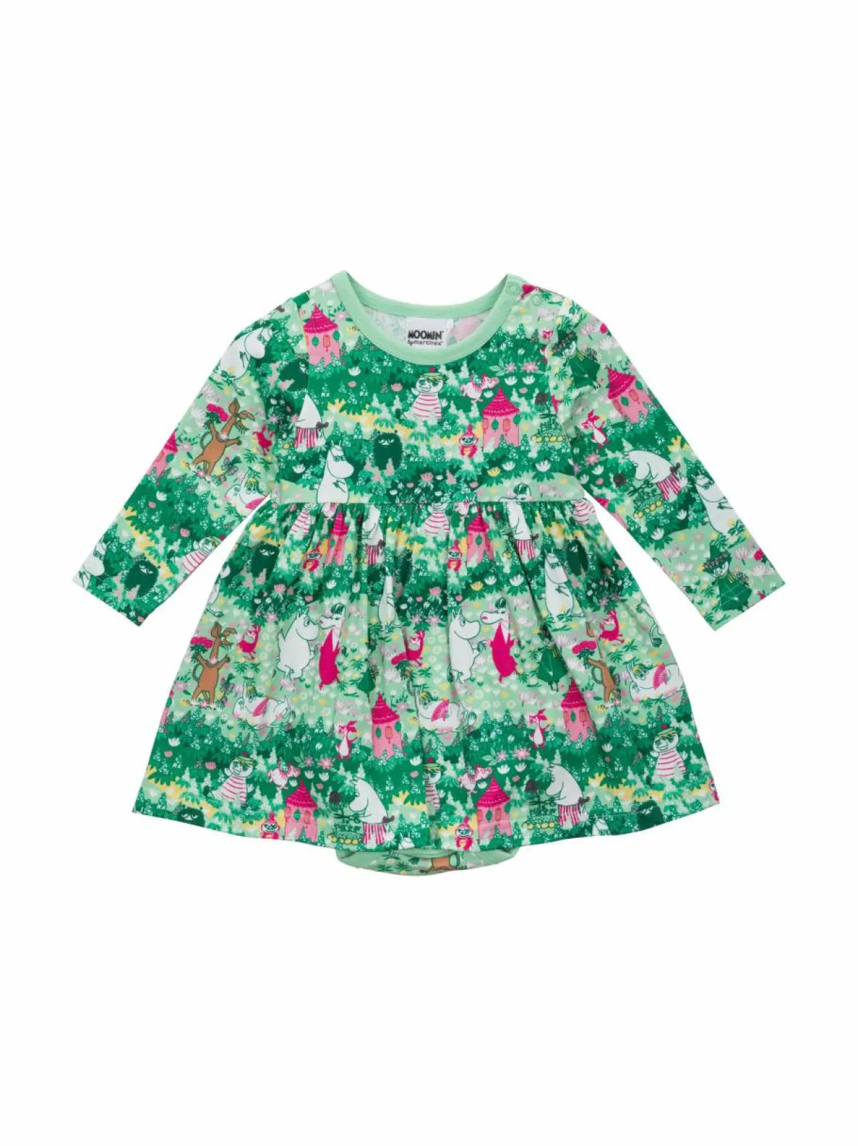 Greenery on ihastuttava Muumi-bodymekko vauvoille. Mekossa on pitkät hihat, leveä helma sekä napit olkapäillä ja haarassa. Bodymekko on valmistettu luomupuuvillasekoitteesta. Mekko on pehmeä ja mukava päällä. Se on täydellinen valinta vauvalle, joka rakastaa Muumeja.