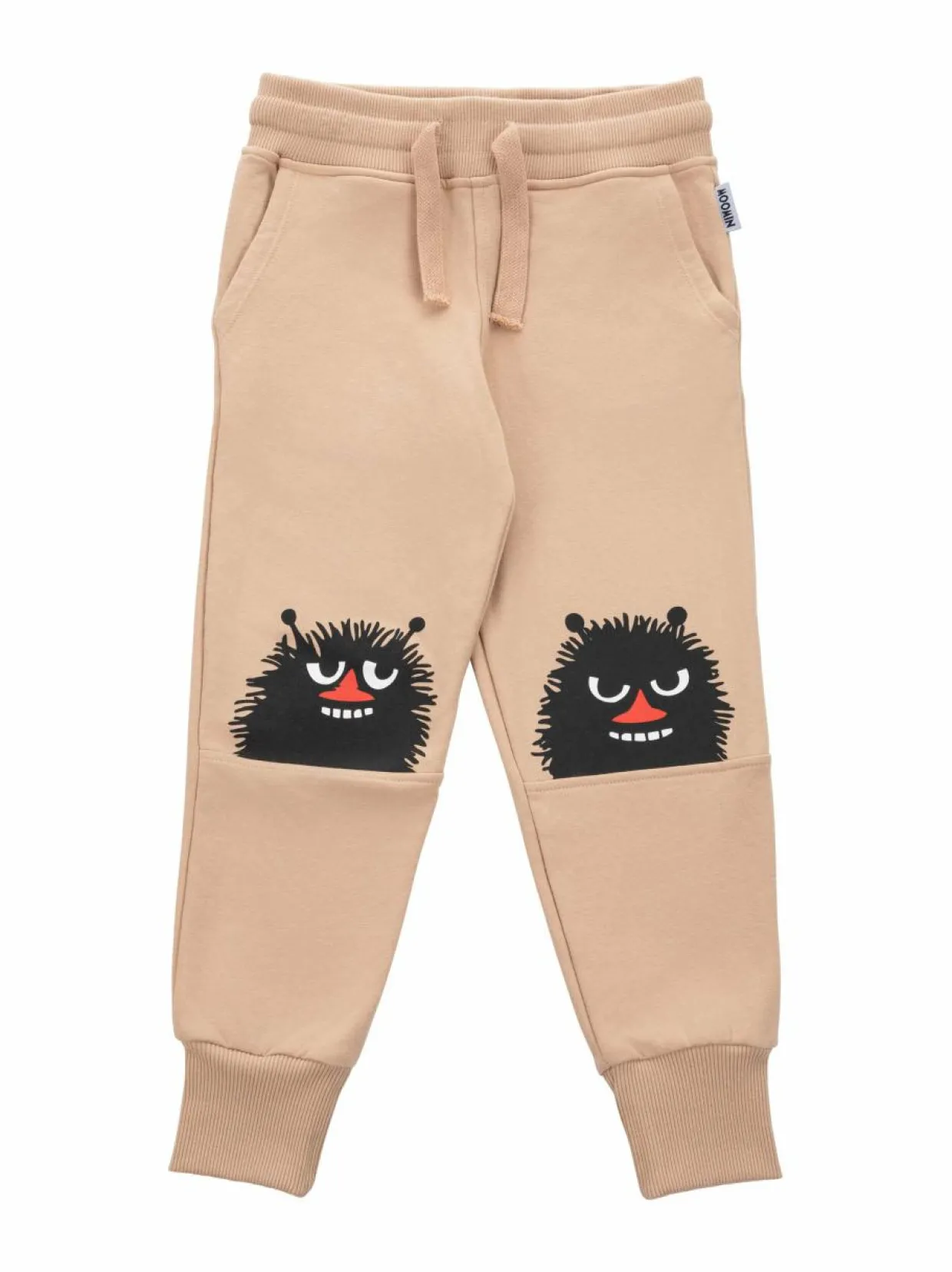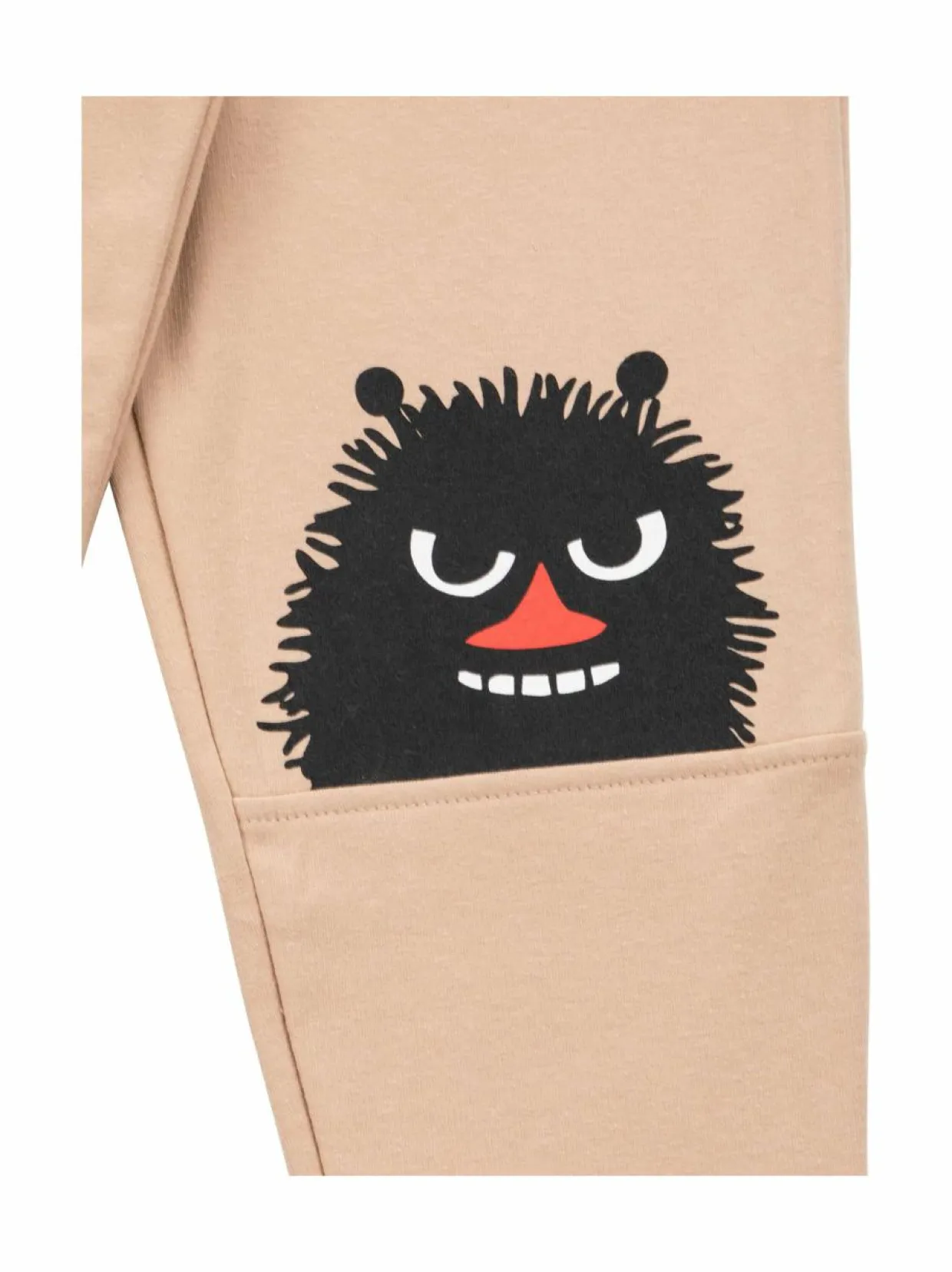 Lasten pehmeät, pitkälahkeiset collegehousut, joissa on sivutaskut, joustava vyötärö kiristysnauhalla, resorit ja pehmeäksi harjattu sisäpuoli. Lahkeiden polvissa on iloiset kuvat hyväntuulisesta Haisulista.
