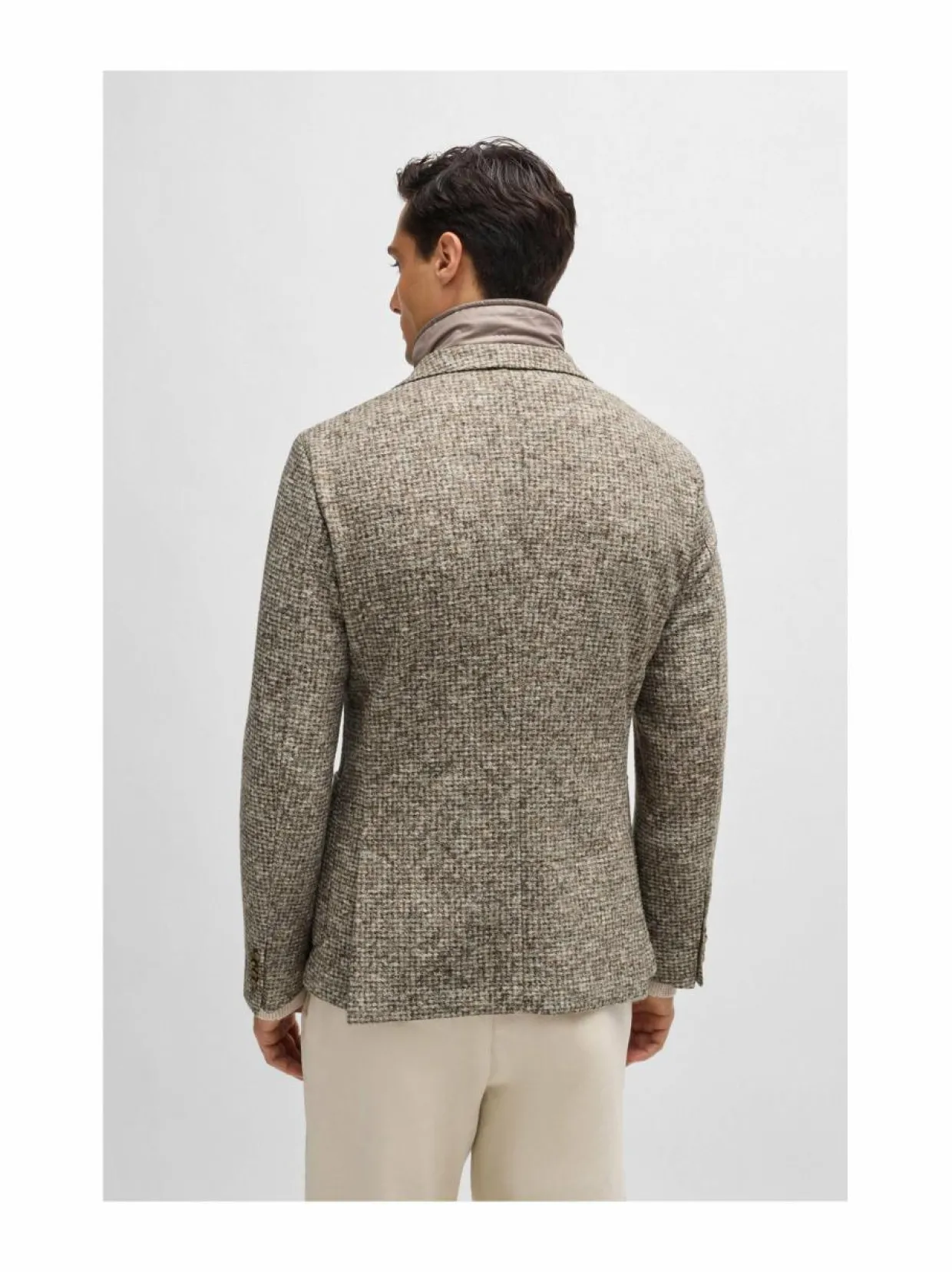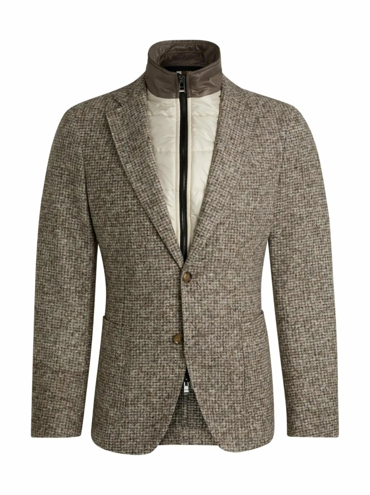 BOSS merkin moderni bleiseri irrotettavalla, topatulla sisäosalla. Irtotakki on suunniteltu tyköistuvaan slim fit -istuvuuteen. Materiaalina miellyttävän tuntuinen jersey-kangas, johon on lisätty myös lämmittävää villaa. Takahelman halkiot lisäämässä käyttömukavuutta.