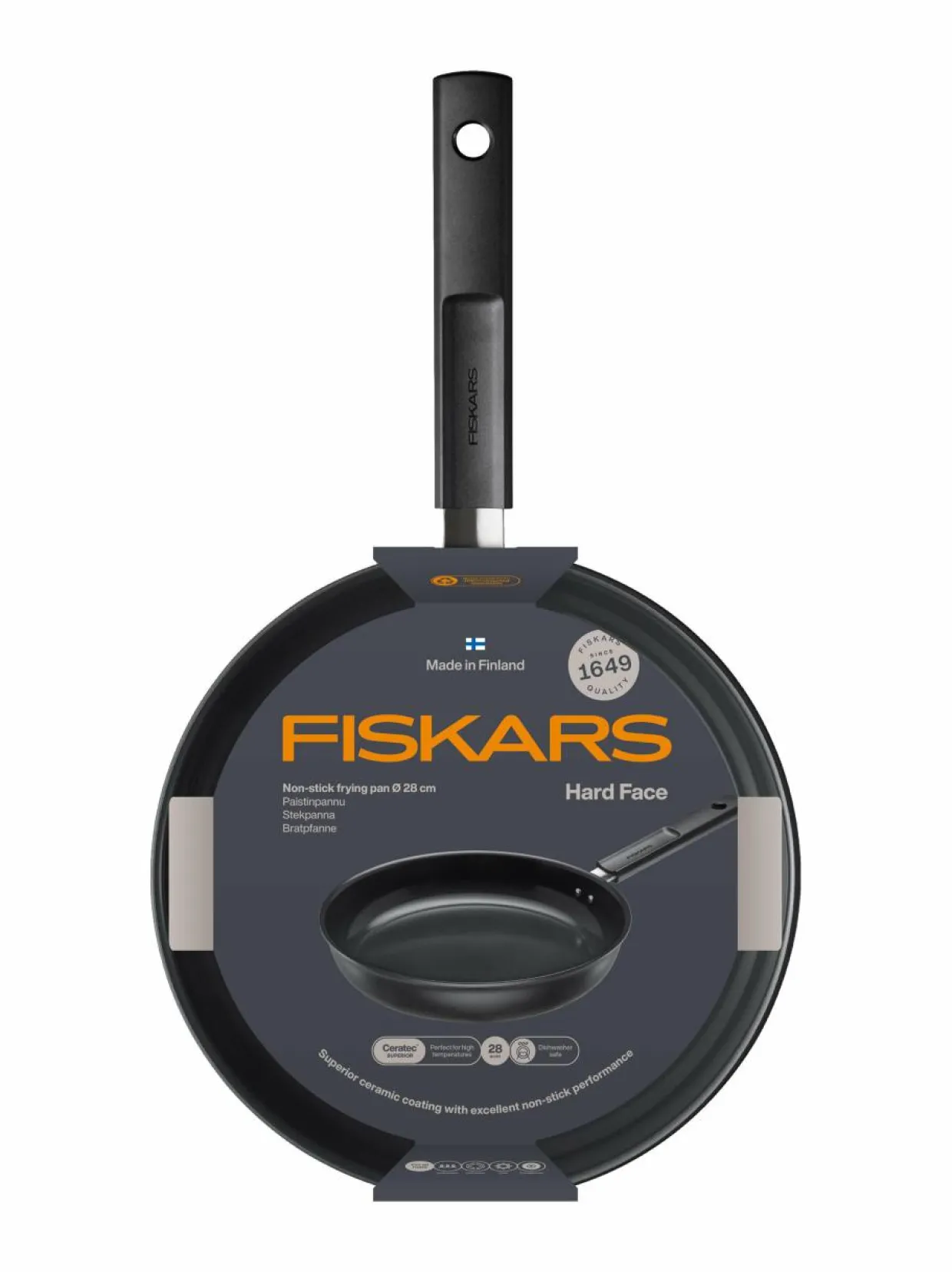 Fiskars Hard Face -sarja on suunniteltu vaativimpaankin arjen ruuanlaittoon. Tämä 28 cm leveä paistinpannu on myös modernin muotoilun taidonnäyte. Sen kestävä kolmikerroksinen runko on valmistettu ruostumattomasta teräksestä, joka kuumenee tehokkaasti ja nopeasti. Kahva takaa hyvän otteen ja pysyy ihanan viileänä.