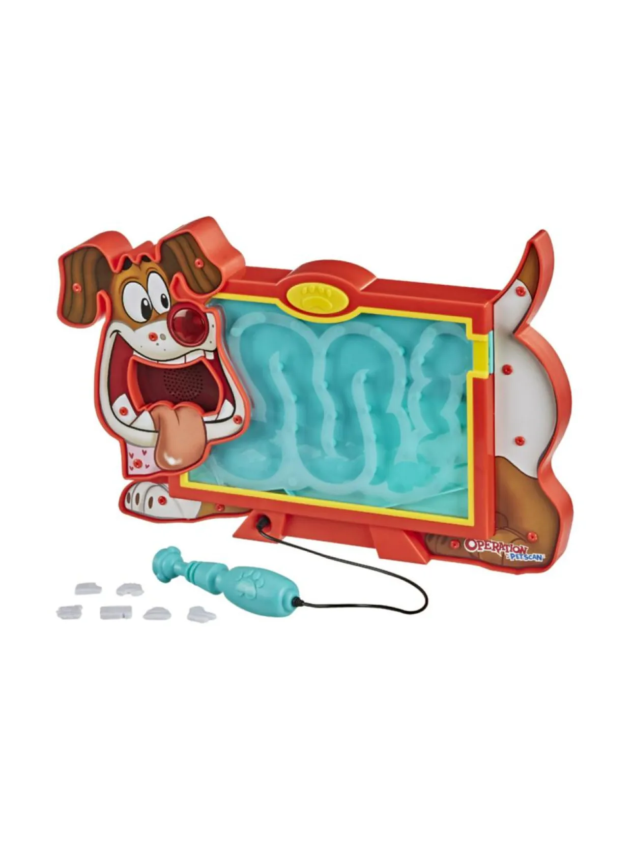 Hasbron peli sopii koko perheelle! Operation Pet Scan -peli on hauska erilainen versio klassisesta Operation-pelistä. Samin koira Rex-Ray on syönyt kaikenlaista, ja pelaajien pitää saada esineet ulos sen vatsasta. Pelaajat yrittävät ohjata hauvaskoopilla muovisia esineitä Rex-Rayn mahassa ja ulos toisesta päästä ilman, että ne putoavat matkalla. Jos pelaaja eksyy reitiltä, summeri surisee ja koiraa vaivaava esine putoaa. Jos se putoaa koiran mahasta, pelaajan vuoro päättyy. Kun poistat esineen onnistuneesti, koira haukkuu tai pieraisee helpottuneena. Aktivoi Operation Pet Scan -pelin hassut äänitehosteet painamalla koiran nenää, niin voit kuulla haukkumista, mahan murinaa ja pieruja. Se on hauska lahja 6-vuotiaille ja sitä vanhemmille.
