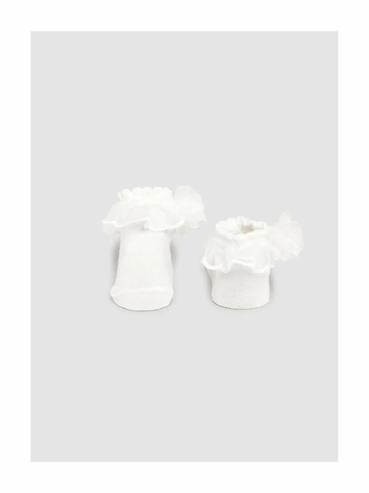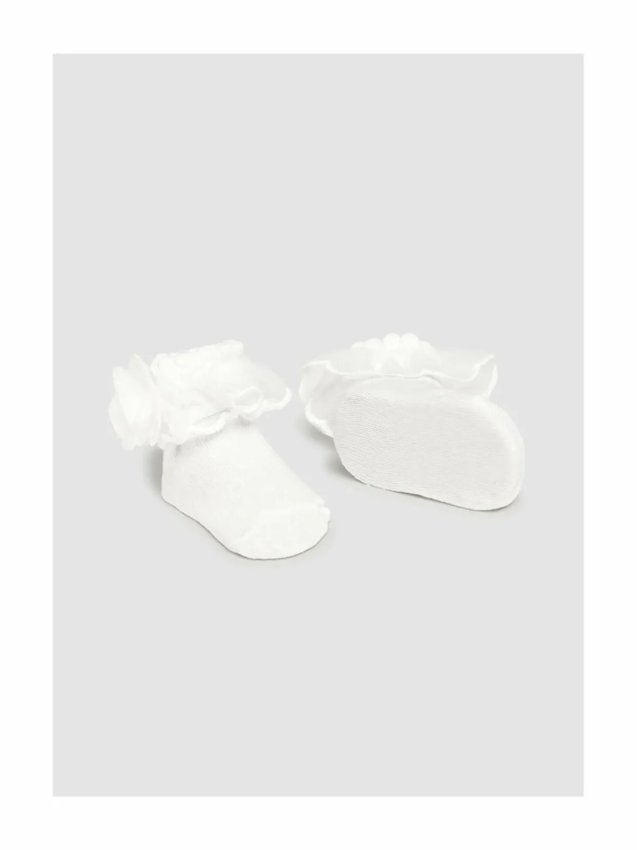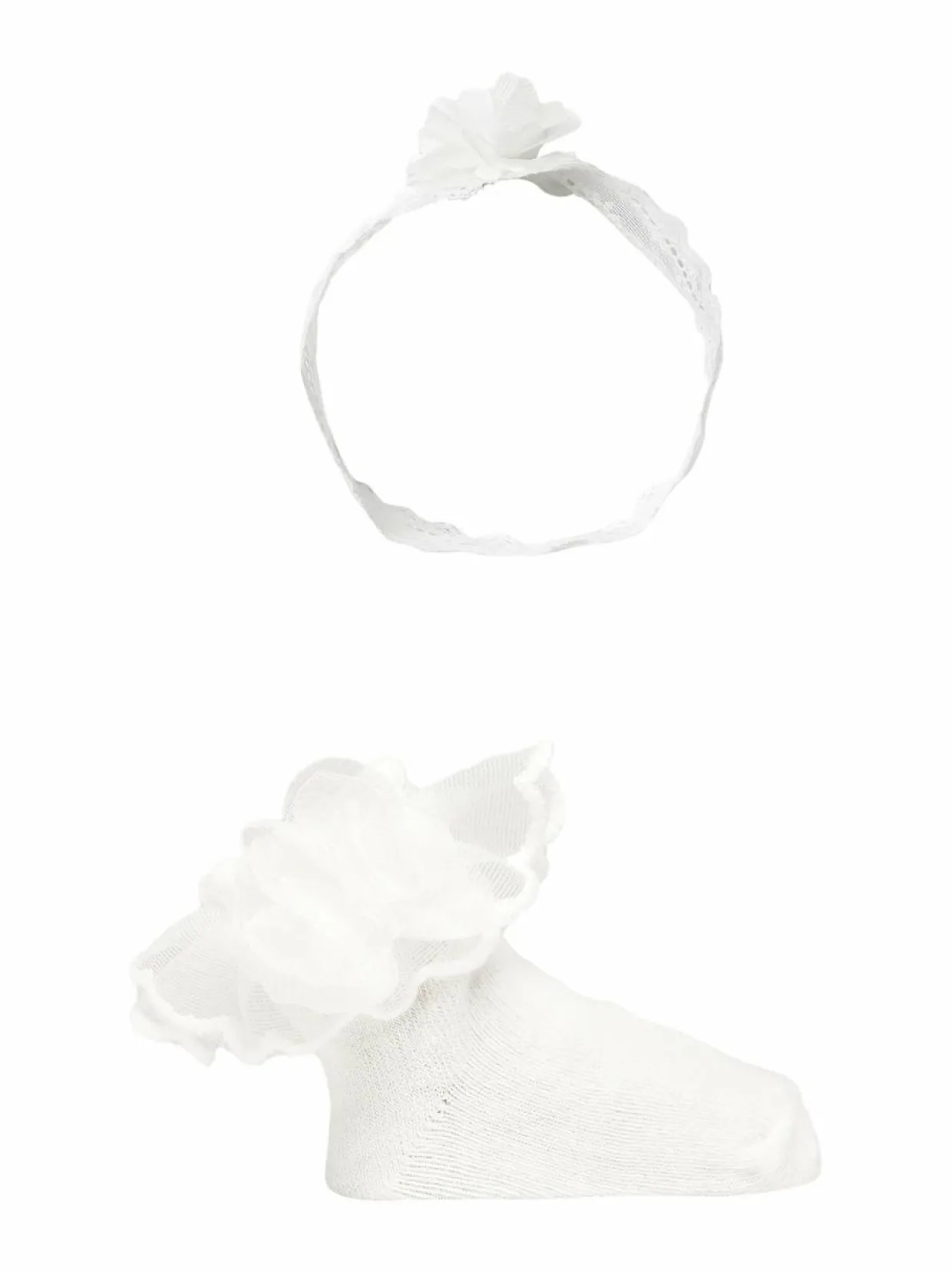 Ihastuttava pakkaus, johon kuuluu söpöt sukat ja hiuspanta. Sukat ovat pehmeät ja mukavat, ja niissä on kaunis kukkamainen somiste nilkassa. Hiuspanta on valmistettu pitsistä ja siinä on myös tyyliin sopiva kukka-somiste. Sukat ja hiuspanta ovat täydellinen lahja pienokaiselle, joka pitää röyhelöistä ja pastellisistä sävyistä.