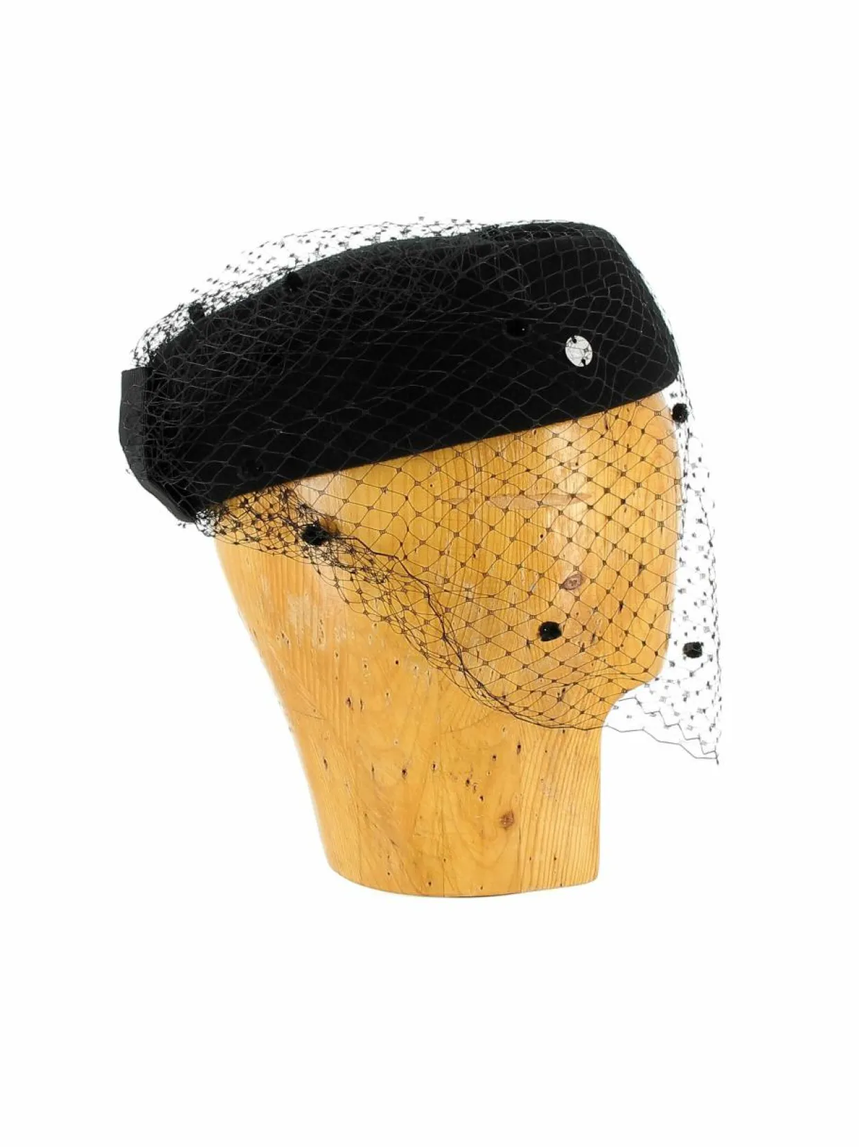 Näyttävä hattu villakankaasta. Hattua peittää ohut verkkokangas.