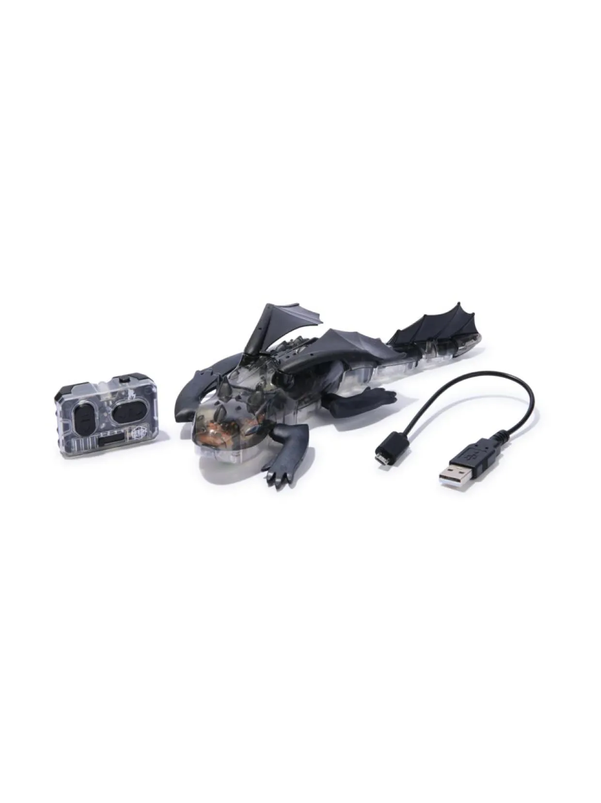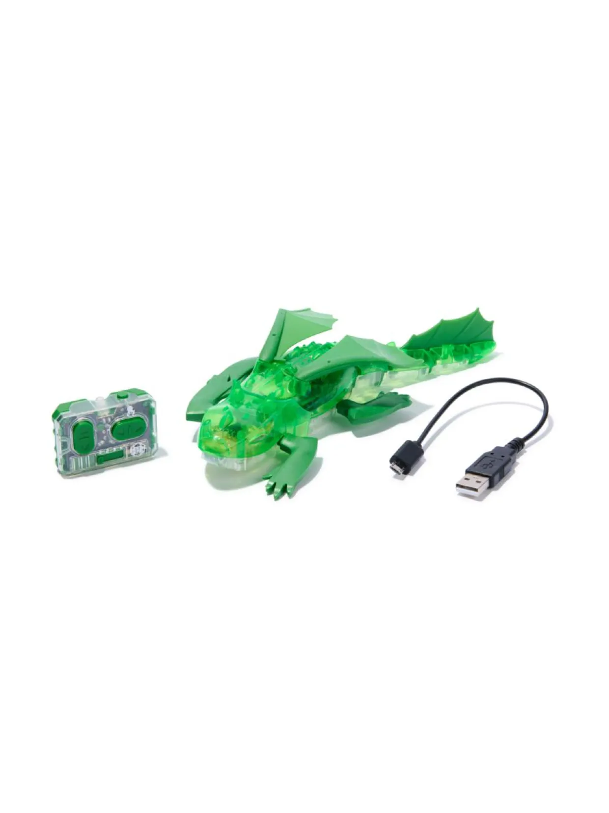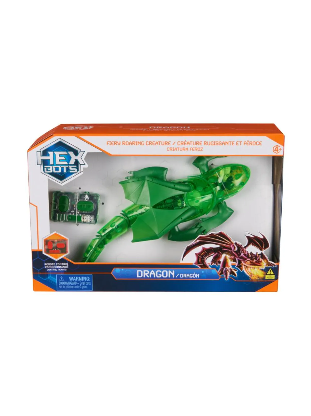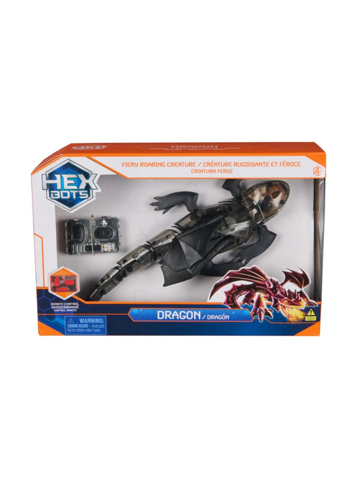 HEX BOTS -lohikäärme on noussut myyttien ja legendojen liekeistä! Katso, miten se luikertelee millä tahansa pinnalla syöksien LED-valotulta ja karjuen raivokkaasti kaikille, jotka uskaltavat tulla sen lähelle. Tehokkaan kauko-ohjaimen avulla ohjaat lohikäärmeen jokaista liikettä! Kumiset, pyörivät tassut, pelottavat, säädettävät siivet ja puolelta toiselle liikkuva taipuisa pyrstö saavat kaverisi luulemaan, että tämä robottiolento on elävä!