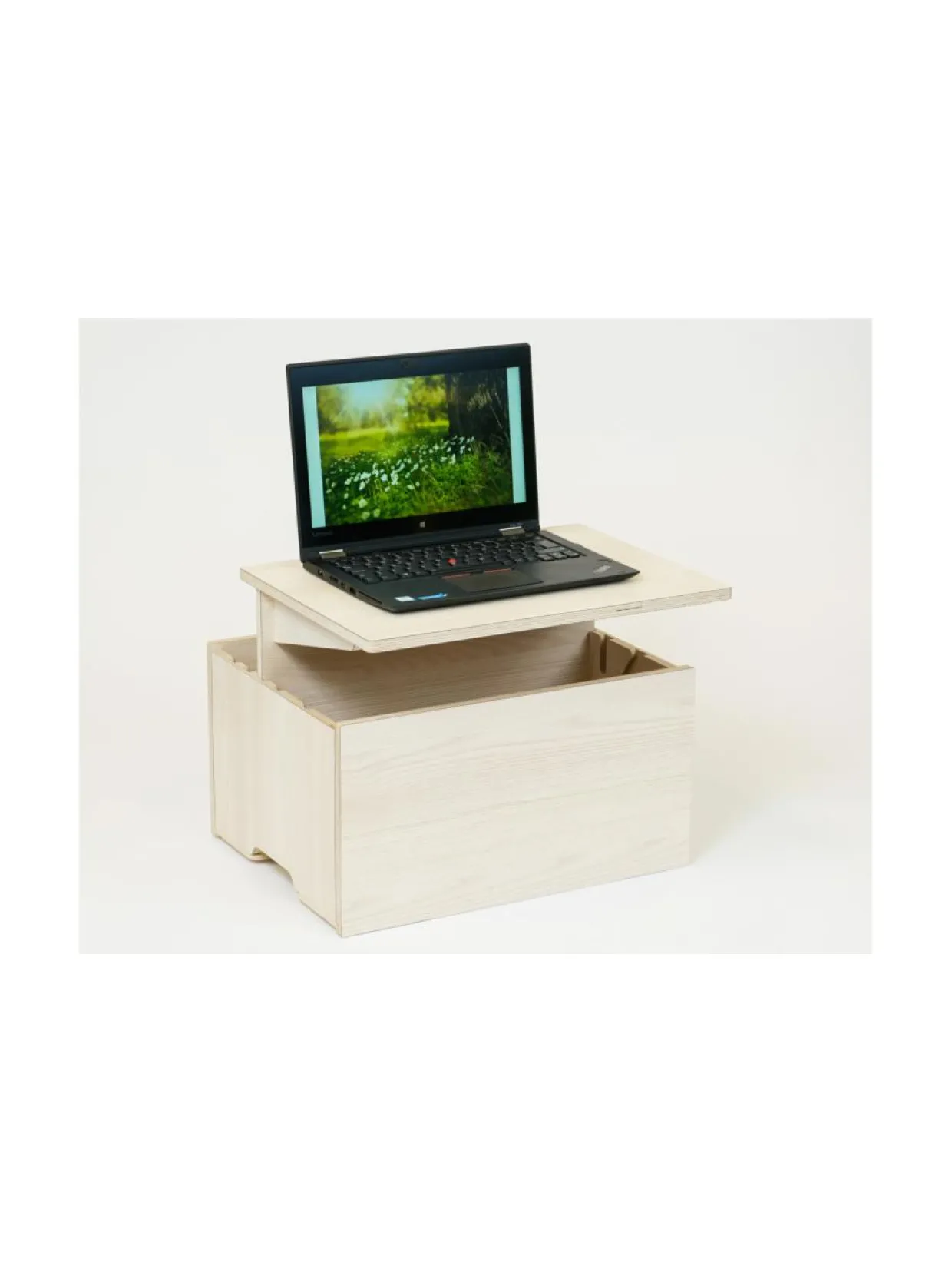 Fiksumpi, ekologisempi ja tehokkaampi tapa työskennellä. Magic Boksi on patentoitu suomalainen innovaatio. Se on loistava etätyön ergonomiatuote jota voit käyttää työskentely- ja säilytysratkaisuna sekä osana kotisi sisustusta. Magic Boksin avulla parannat läppärityöskentelyn ergonomiaa ja käytät sitä myös moneen muuhun tarpeeseen. Tässä laatikossa voit säilyttää johdot, laturit ja tietokoneen tai muita esineitäsi. Kannen, joka on samalla työtaso, korkeutta voidaan säätää neljään eri korkeuteen ja myös kallistettuna käyttää lukutelineenä tietokoneelle tai tabletille. Tuote on valmistettu Suomessa 14 mm paksusta kestävästä koivuvanerista, joka on laminoitu. Materiaalit ovat suunniteltu siten, että tuote kestää kulutusta.