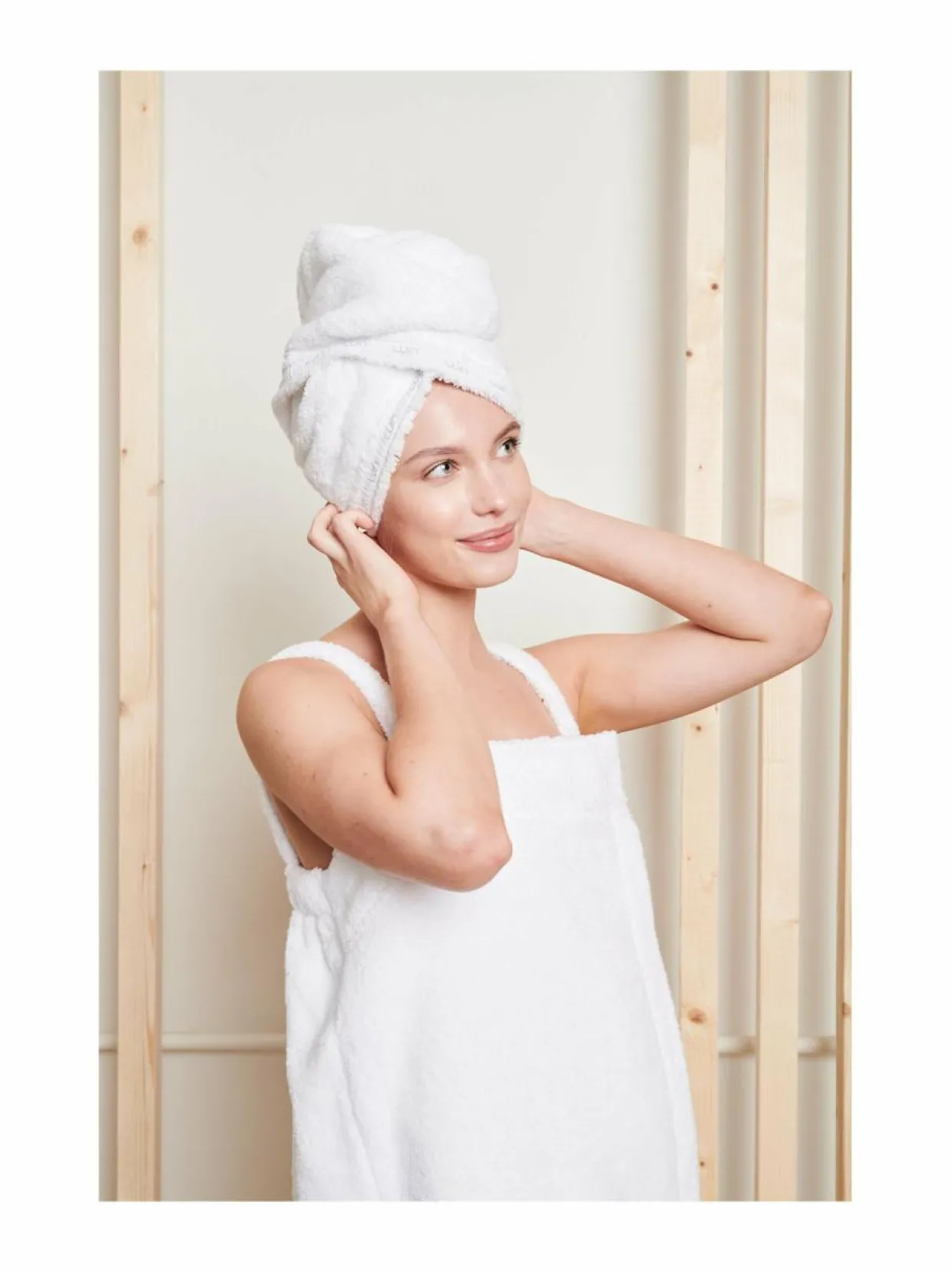 Luin Livingin ylellinen hiuspyyhe on täydellinen apulainen arkeen. Hiuspyyhe kuivaa hiukset tehokkaasti, pysyy hyvin paikallaan ainutlaatuisen nepparikiinnityksen avulla, tuntuu ihanan pehmeältä päässä ja näyttää tyylikkäältä. Tuote sopii kaikenikäisille ja kaiken pituisille hiuksille. Hiuspyyhe toimii erinomaisesti myös hiusten suojana esim. saunassa tai paljussa. Yksi koko 26 × 70 cm sopii kaikille.