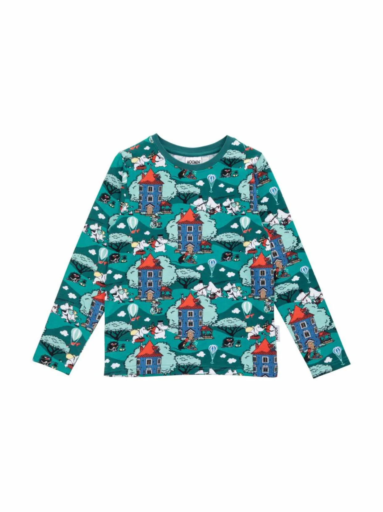 Pehmeä ja mukava Muumi Home yard -trikoopaita lapsille. Pitkillä hihoilla ja pyöreällä pääntiellä varustettu paita on valmistettu joustavasta luomupuuvillasekoitteesta. Paita on täynnä hauskoja muumikuvioita, jotka tekevät siitä ainutlaatuisen.