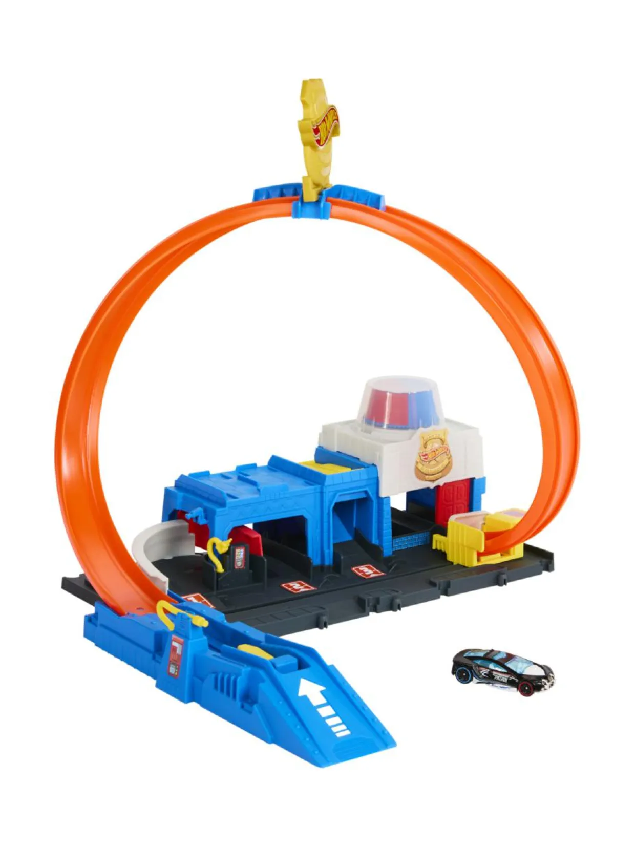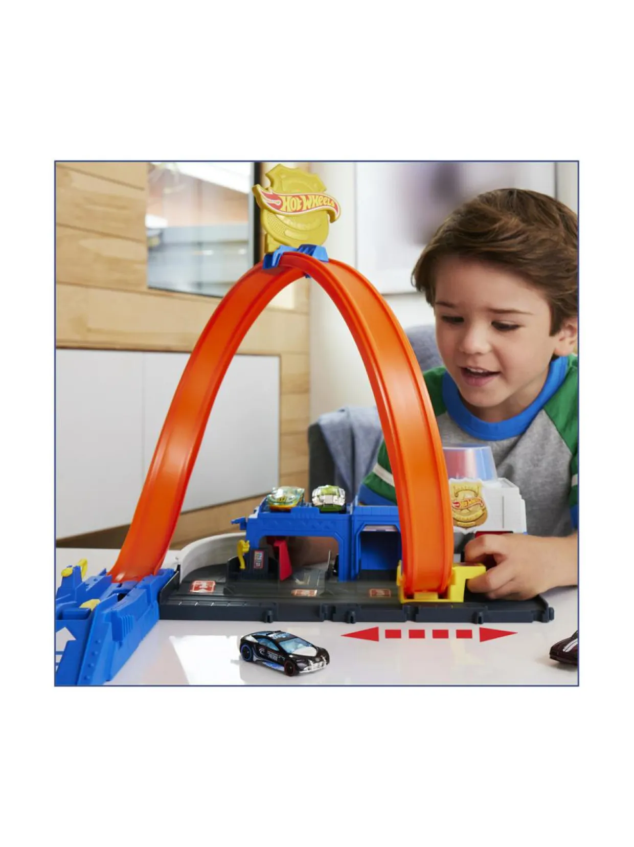 Hot Wheels City Super Poliisiasema sisältää yhden ajoneuvon, ja säädettävän radan ansiosta se tarjoaa loputtomasti tapoja ajaa kilpaa autoilla ja tehdä temppuja. Setissä on useita erilaisia rataosia, joten voit luoda ihanteellisen kilparadan. Yhdistä rata muihin Hot Wheels -setteihin luodaksesi entistäkin jännittävämpiä seikkailuja.