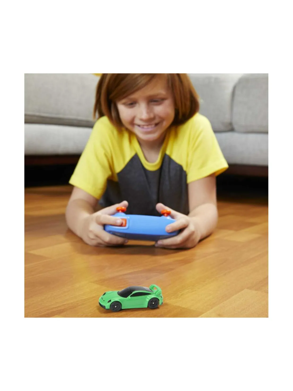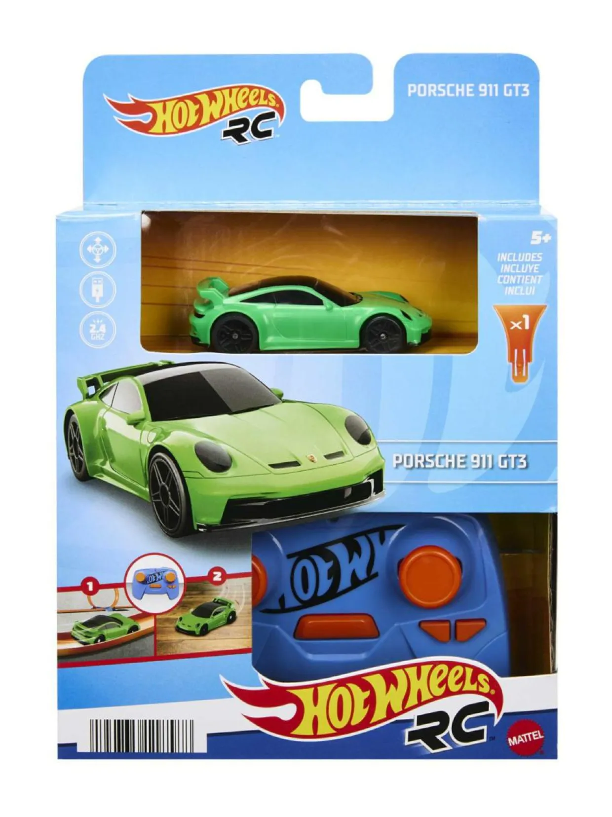 Hot Wheels Porsche 911 -kauko-ohjaimella. Hot Wheels R/C -auton mittasuhde on 1:64 ja siinä on erityiset aidot yksityiskohdat ja huippuluokan muotoilu – aivan kuin oikea auto. Sitä voidaan käyttää oranssilla Hot Wheels -radalla (myydään erikseen) sekä ilman rataa. Paina kauko-ohjaimen turbovahvistinpainiketta saadaksesi lisänopeutta temppuihin!
