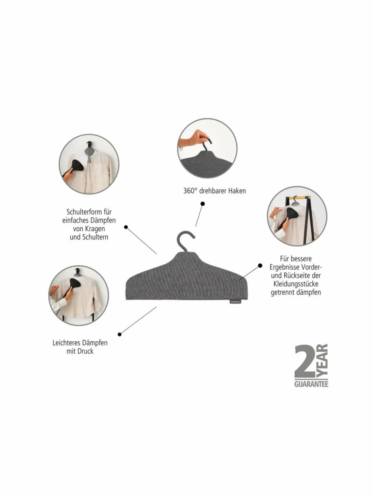 - Ripustimen olkapäämuoto tekee kaulusten ja hartioiden höyryttämisestä vaivatonta ja tehokasta.