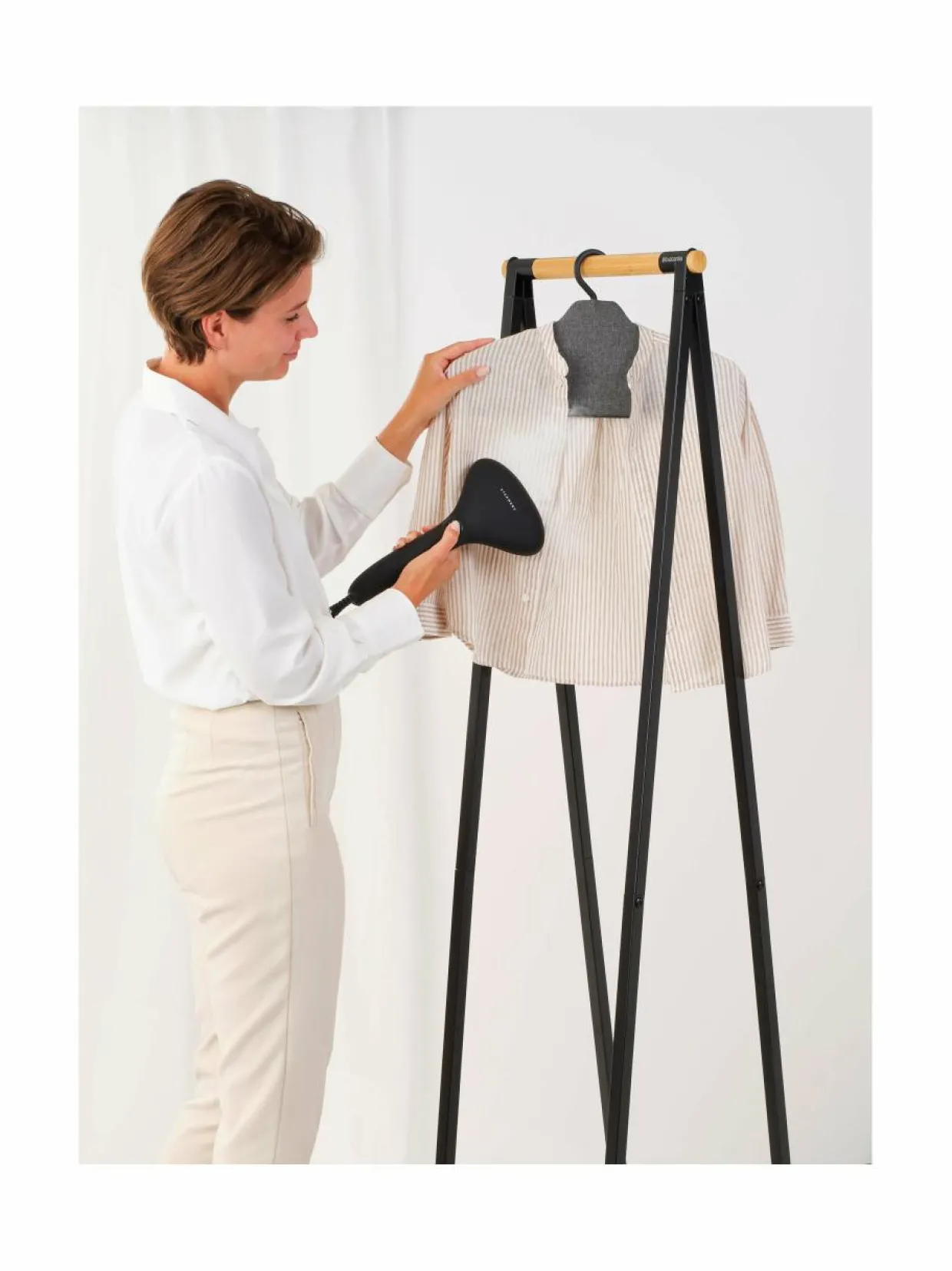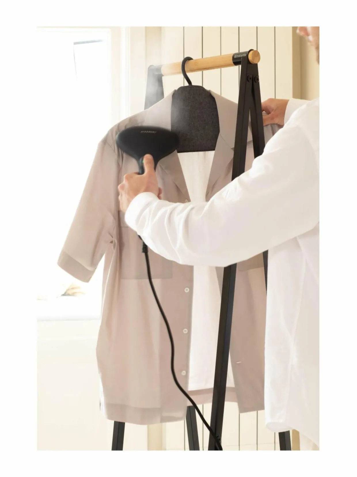 Brabantian höyrytysvaatehenkari mahdollistaa vaatteiden helpon tavan pitää tekstiilit ryhdikkäinä ja virheettöminä ilman silitystä. Höyrytysvaatehenkari tekee höyryttämisestä vaivatonta ja nopeaa. Suunniteltu käytettäväksi vaatehöyrystimen kanssa. Tämä höyrytysripustin helpottaa ja nopeuttaa haastavien kaulusten, olkapäiden sekä laskosten siistimistä huomattavasti.
