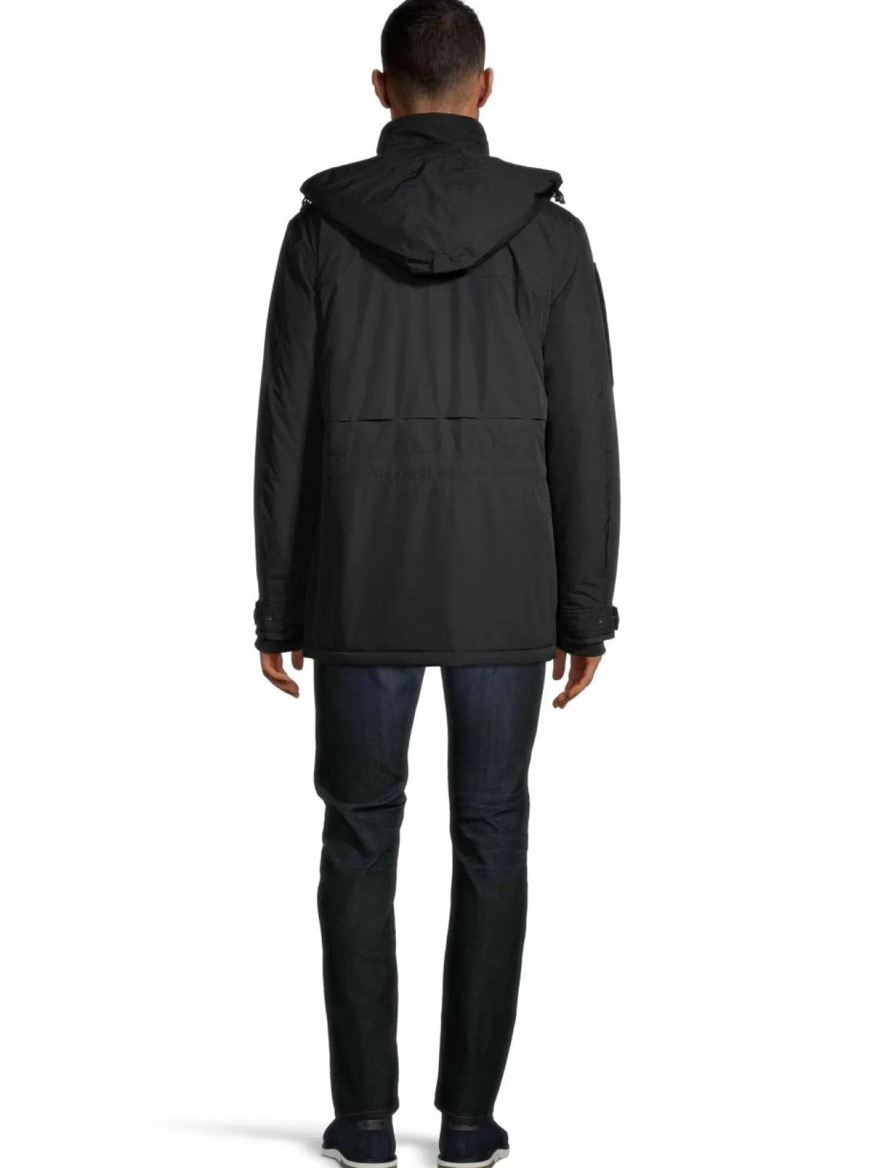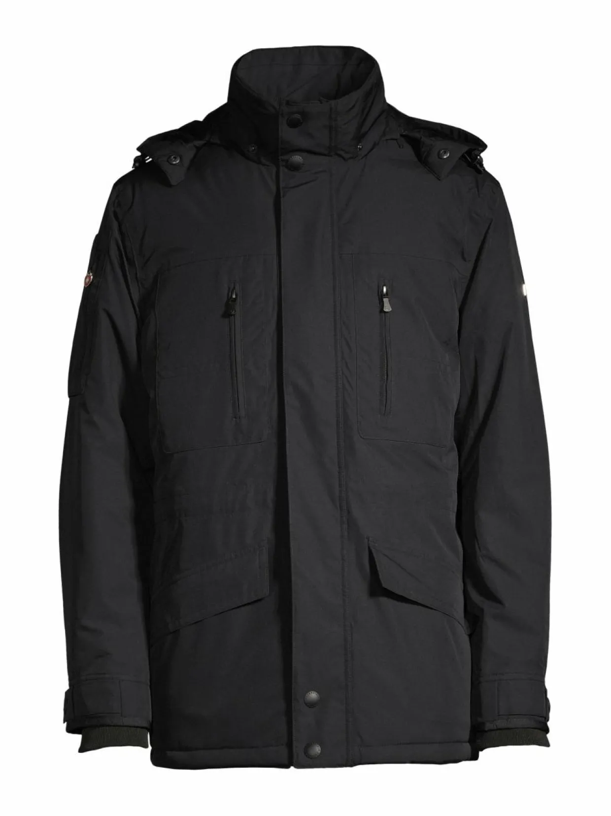Suoramallinen miesten toppatakki hupulla. Viisi ulkotaskua, yksi matkapuhelintasku, kaksi vetoketjullista sisätaskua ja tasku vuorauksessa tarjoavat erilaisia mahdollisuuksia henkilökohtaisten tavaroiden turvalliseen säilyttämiseen. Vuorattu huppu on irrotettava. Kiinnitys kaksisuuntaisella vetoketjulla.