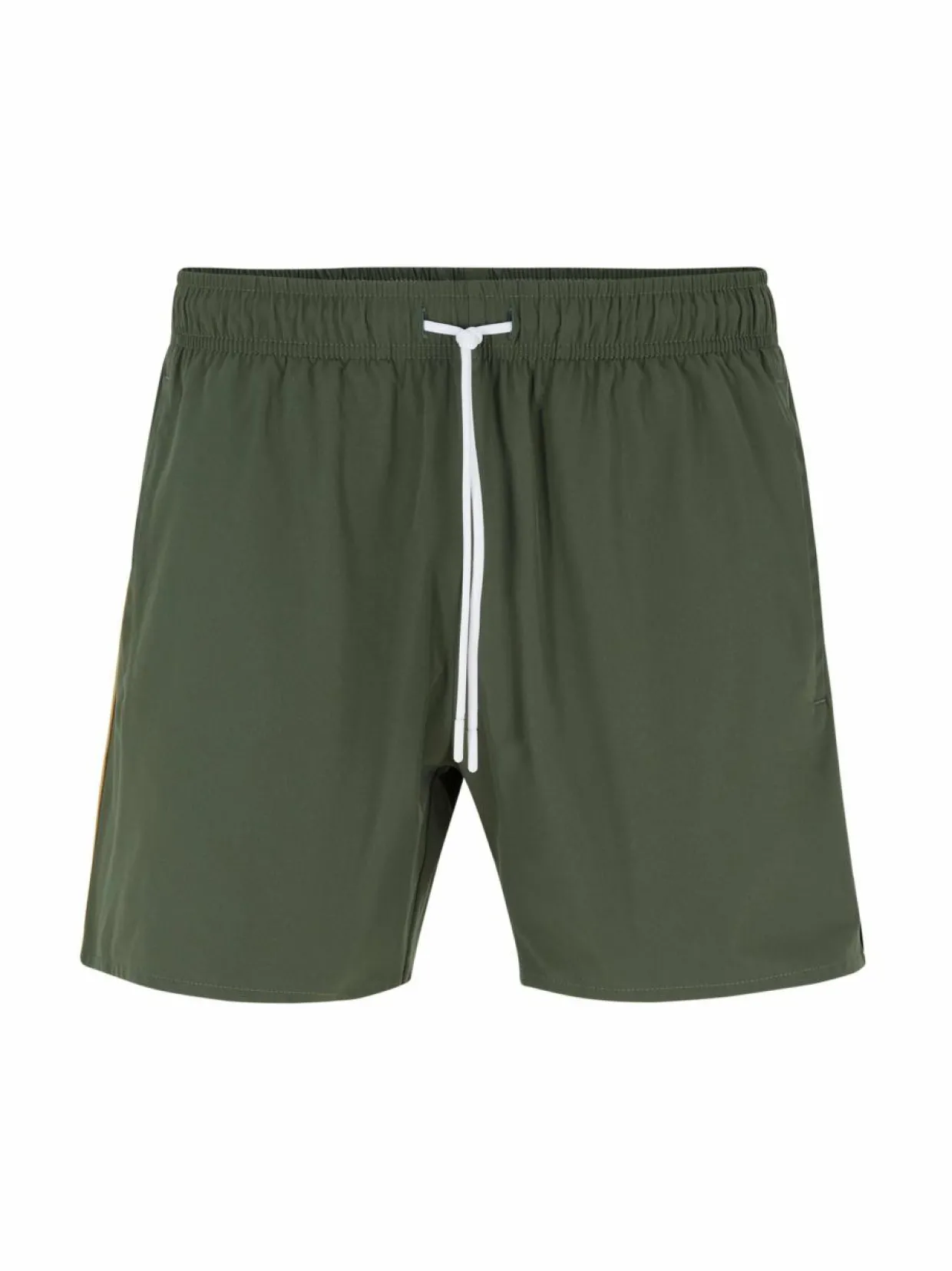 Uimashortsit, joiden sivuja koristavat raidat. Takana kiinniommeltu tasku. Materiaalina kierrätyspolyesteri.