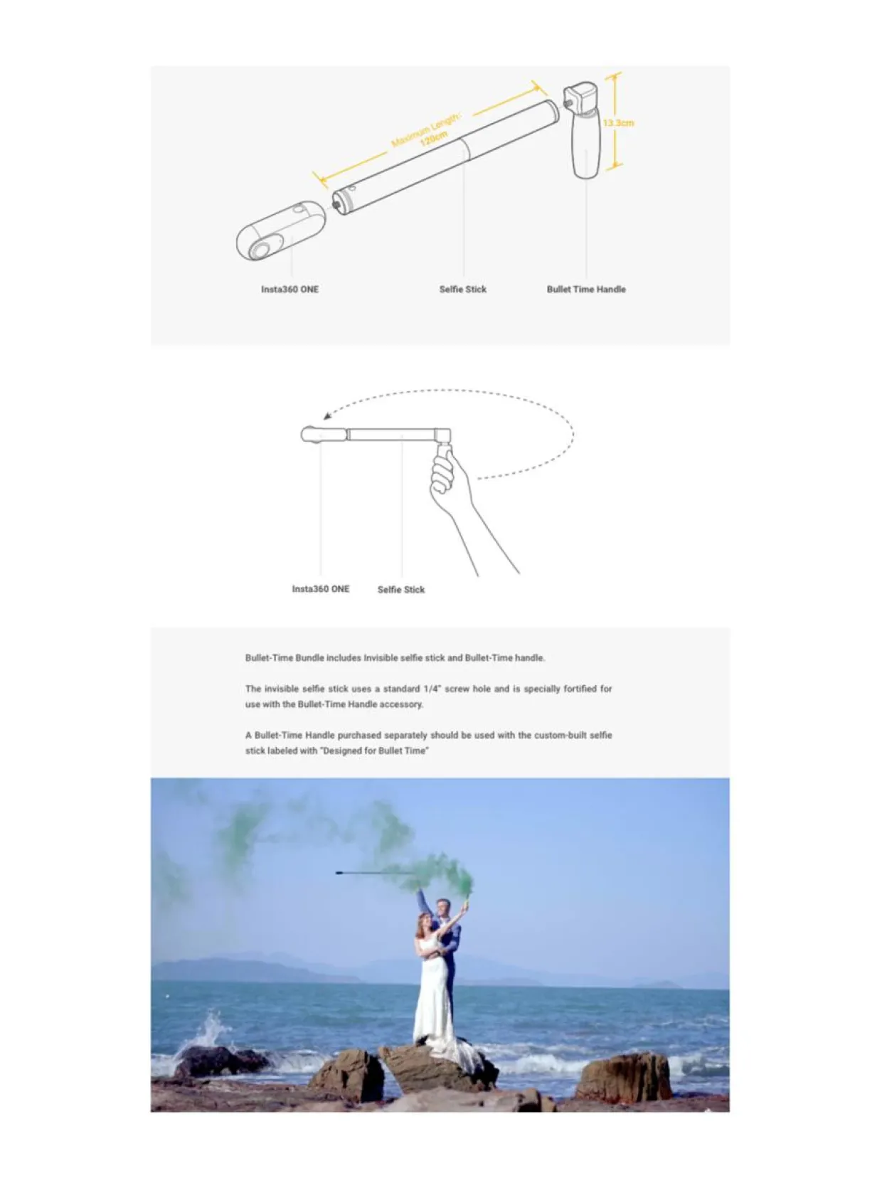 Bullet-time Handle & Stick on yhdistemä, jossa on Insta 360 Selfie Stick (27-120cm) sekä pyörivä kahva 90 asteen kulmalla. Tämä mahdollistaa aiempaa vakaammat ns. bullet time kuvat. 90 asteen kulmaosa on tukevaa tekoa. Pyörivässä keskiosassa on kaksi kuulalaakeria. Kameran algoritmin ansiosta varsi pysyy näkymättömänä 360 asteen videoissa ja kuvissa.Tuotenumero720147