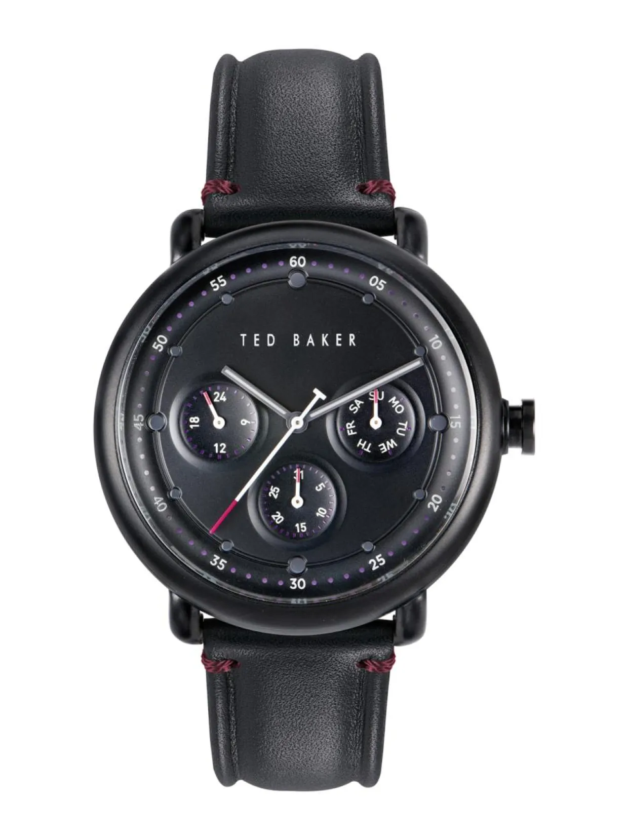 Ted Baker IvyBrid 43mm rannekello tuo sporttisen lisän asukokonaisuuteen. Kellon musta runko on valmistettu ruostumattomasta teräksestä. Sen leveys on 43mm ja paksuus on 12mm. Rannekkeena tässä mallissa on musta nahkaranneke. Mustassa kellotaulussa on 24 tunnin näyttö sekä pienemmät näytöt viikonpäiville ja päivämäärille. Kellossa on mineraalilasi ja kvartsikoneisto. Kellon vesitiiviys on 5ATM. Ted Baker kelloilla on 2 vuoden takuu.