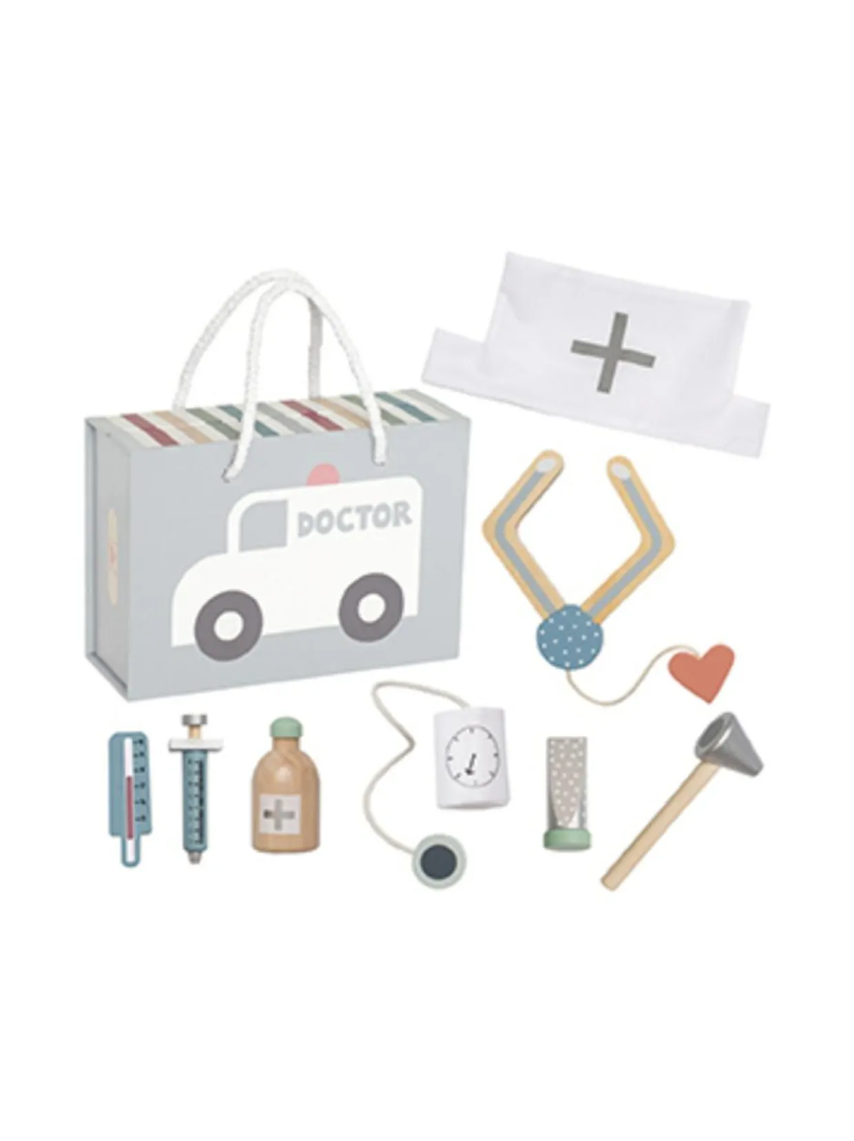 Lääkärisetissä on 9 erilaista hauskaa varustetta eli kaikki mitä pieni lääkäri voikaan tarvita. Setin avulla lapset voivat perustaa vaikka leikkaussalin lastenhuoneeseen. Lääkärinlaukku rohkaisee lasta hauskoihin leikkeihin ja siinä on kaikki, mitä pieni lääkäri saattaakaan tarvita. Lääkärinlaukku sisältää paljon hauskoja varusteita: voiteen, kuumemittarin, ruiskun, stetoskoopin, korva- ja silmäinstrumentin, verenpainemittarin, tabletit, lääkkeen ja sairaanhoitajan hilkan. JaBaDaBaDo on ruotsalainen yritys, joka valmistaa lasten puisia leluja, joissa skandinaavinen muotoilu yhdistyy hauskoihin ja leikkisiin muotoihin sekä ainutlaatuisiin kuvioihin ja nykyaikaisiin väreihin. Jabadabadoon filosofia perustuu konseptiin suunnitella korkealaatuisia ja hauskoja tuotteita, jotka tukevat lasten kehitystä, leikkisyyttä ja mielikuvitusta tuoden hauskuuden ja onnen tunteen lasten taikamaailmaan. Yritys suunnittelee itse kaikki tuotteensa ja ne valmistetaan huolellisesti valituista korkealaatuisista materiaaleista. Suuri osa tuotemallistosta on valmistettu luonnonmateriaaleista, kuten puusta ja puuvillasta.