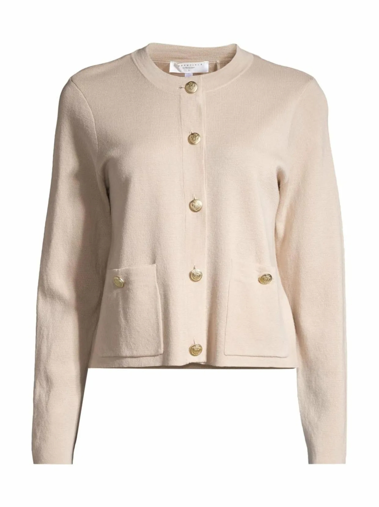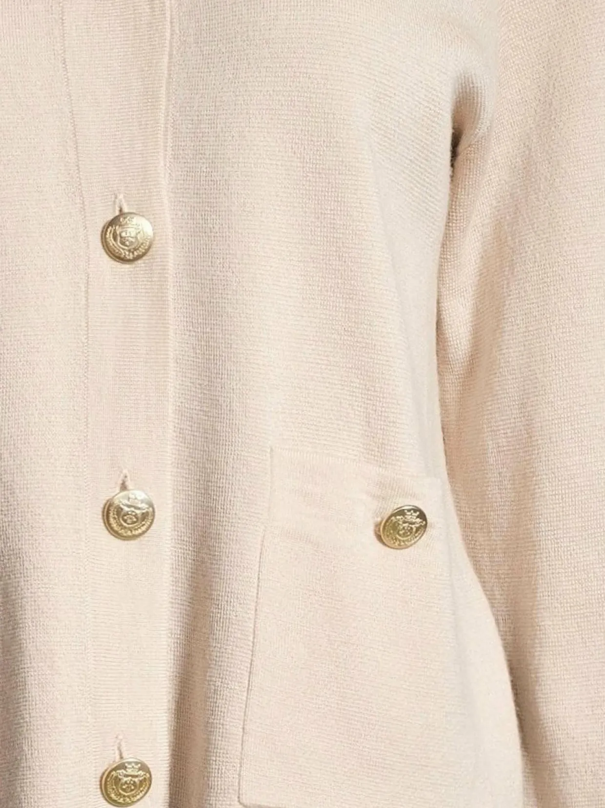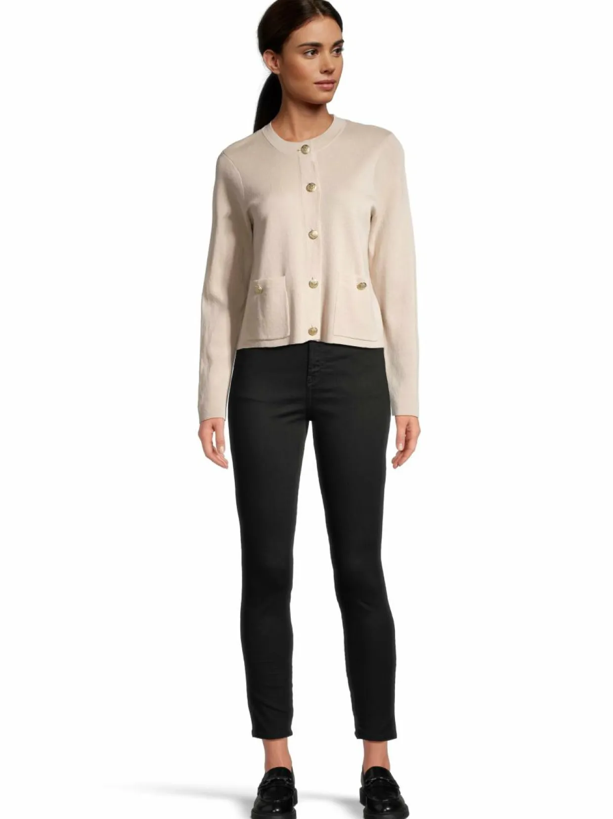 ESSENTIALS by Stockmann Jane -neuletakki on sataprosenttista merinovillaa. Milano-neulos on erityisen tiheä ja sileä, mikä antaa neuletakille ylellisen ja siistin ulkonäön ja pehmeän tunnun. Neuleen kaunis tekstuuri tekee takista kestävän ja ryhdikkään, joten se säilyttää muotonsa käytössä. Pyöreä pääntie ja kullansävyiset elegantit napit luovat klassisen ilmeen, ja pitkät hihat tuovat lisäsuojaa ja lämpöä. Neuletakin mukava leikkaus tekee siitä helpon pukea eri asukokonaisuuksiin.