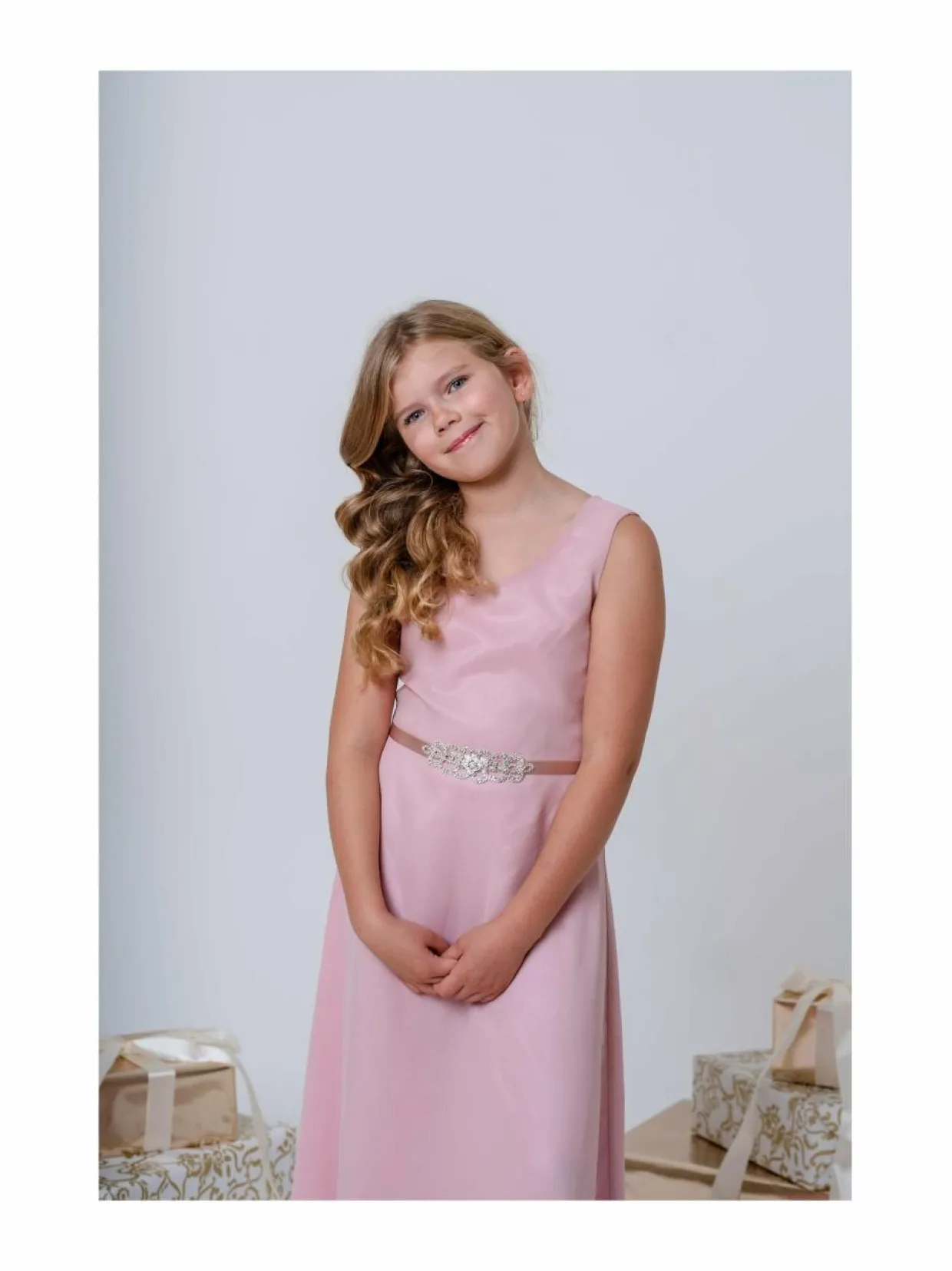 Tyylikäs sifongista valmistettu juhlamekko, jonka vyötäröä kaunistaa kristallikoriste. Mekossa on satiinivuori ja takaosassa pukemista helpottava vetoketju. Anna lapsellesi mahdollisuus tuntea itsensä taianomaiseksi ja elegantiksi tässä upeassa juhlamekossa.