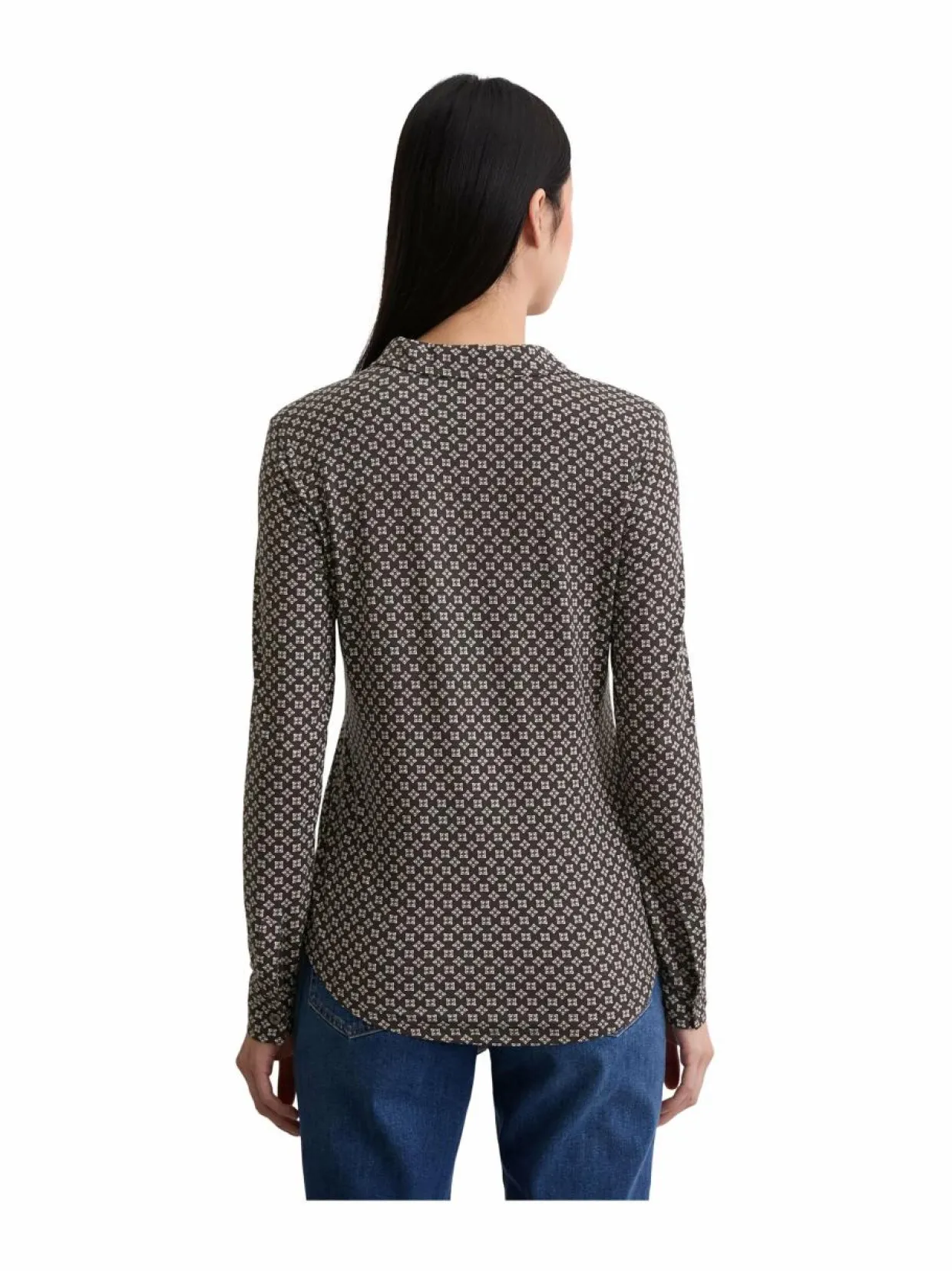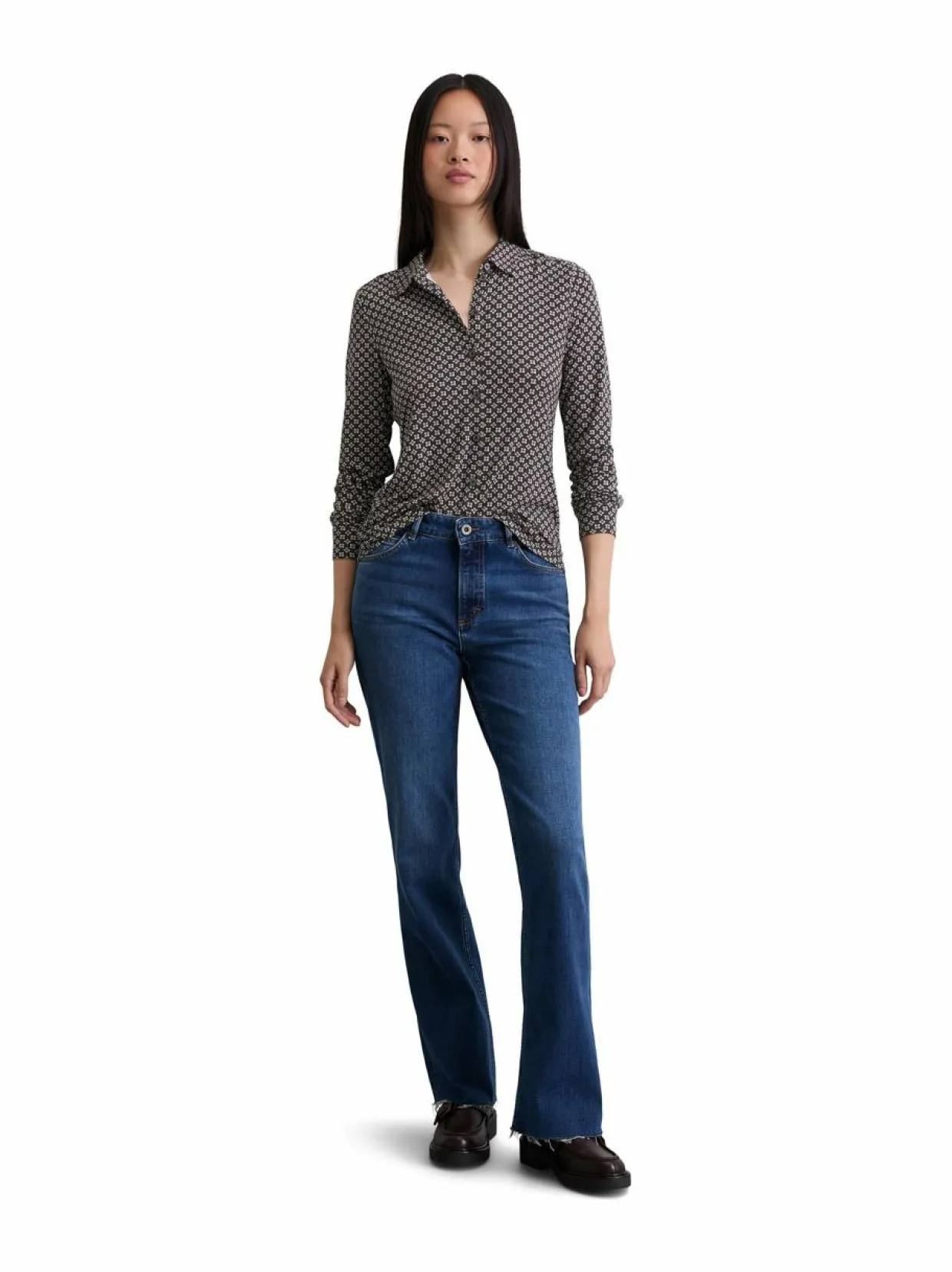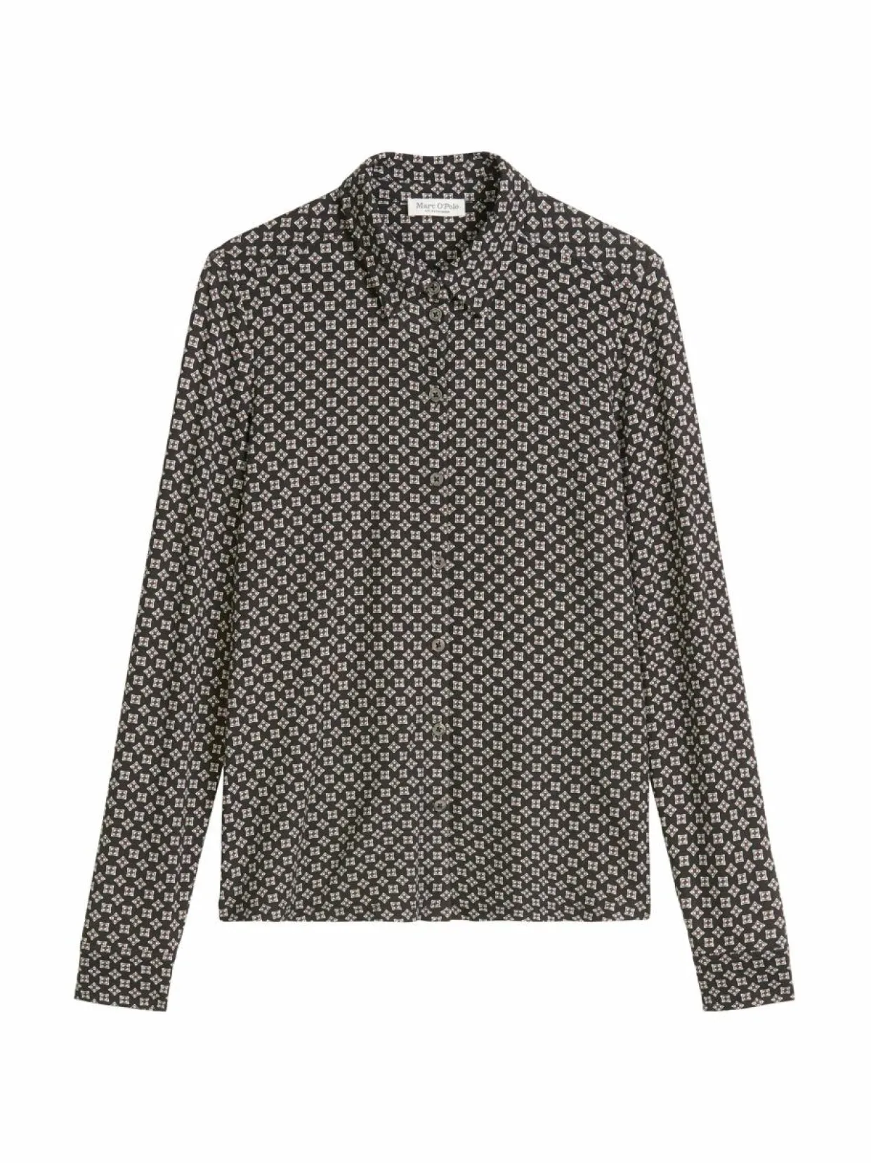 Pitkähihainen paitapusero, jossa on klassinen kaulus ja napit alas asti. Puserossa on retroprintti. Ecovero-viskoosista valmistettu paita tuntuu miellyttävältä iholla ja laskeutuu kauniisti.