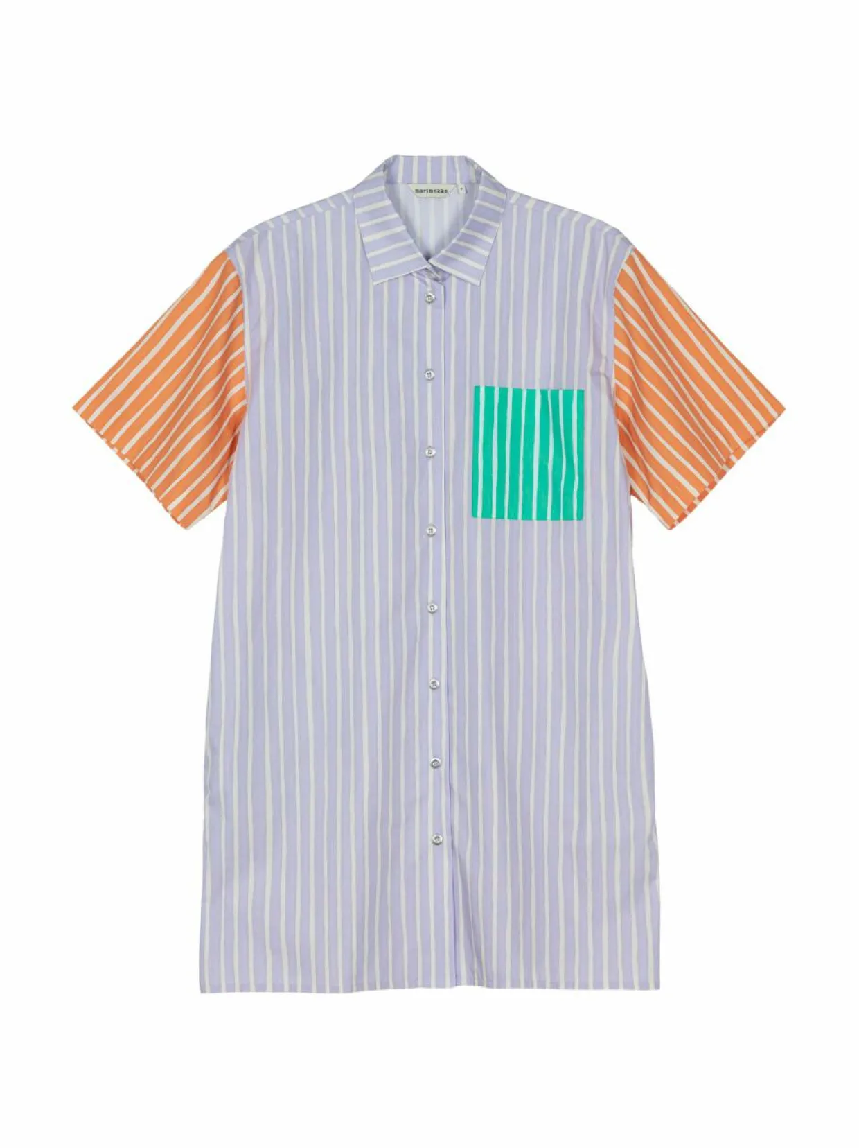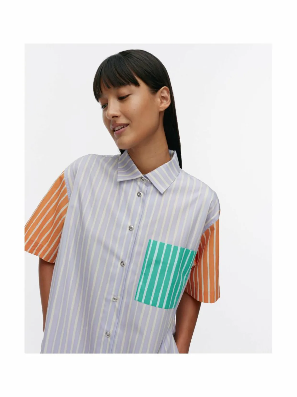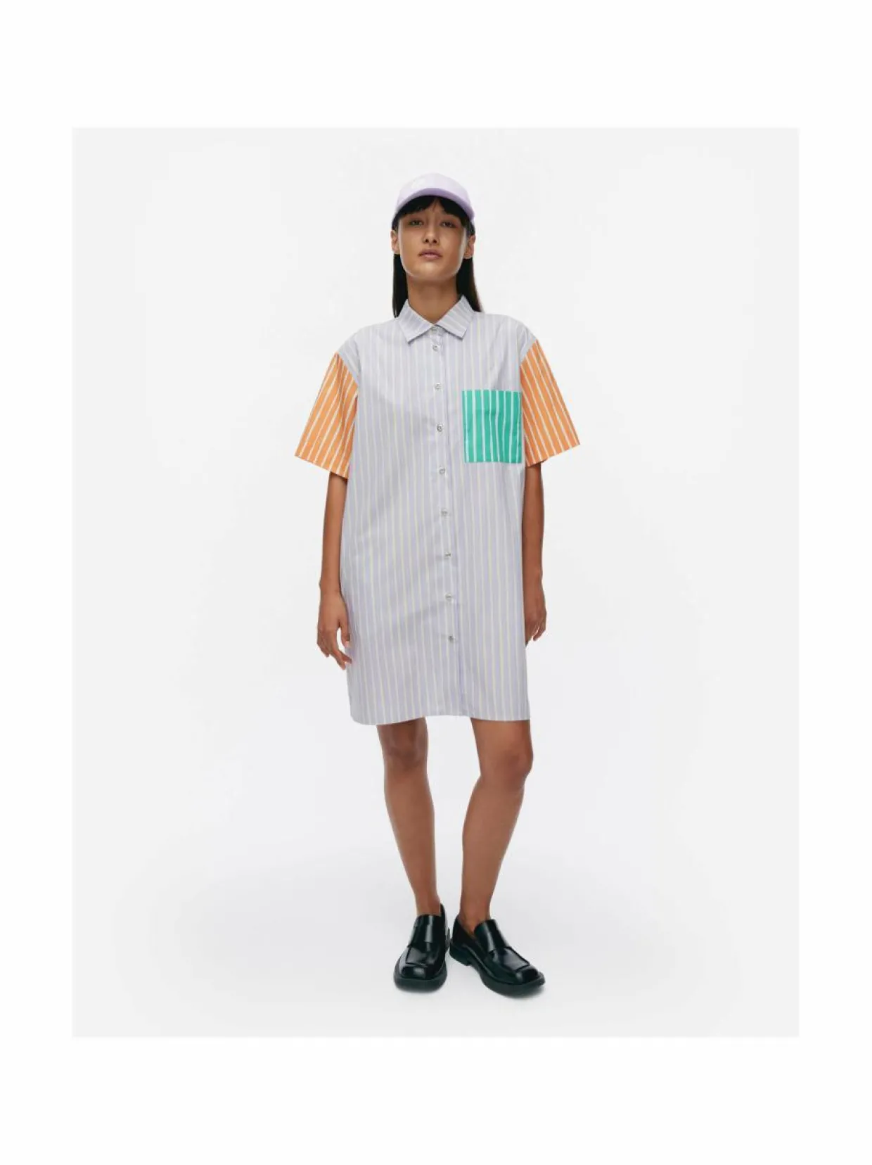 Luomupuuvillasta valmistetussa Jokapoika-paitamekossa on rento istuvuus ja suora leikkaus sekä monivärinen Piccolo-kuosi. Lyhythihaisessa mekossa on kaulukset, metallinappisuljenta ja rintatasku. Kangas on painettu Helsingissä.