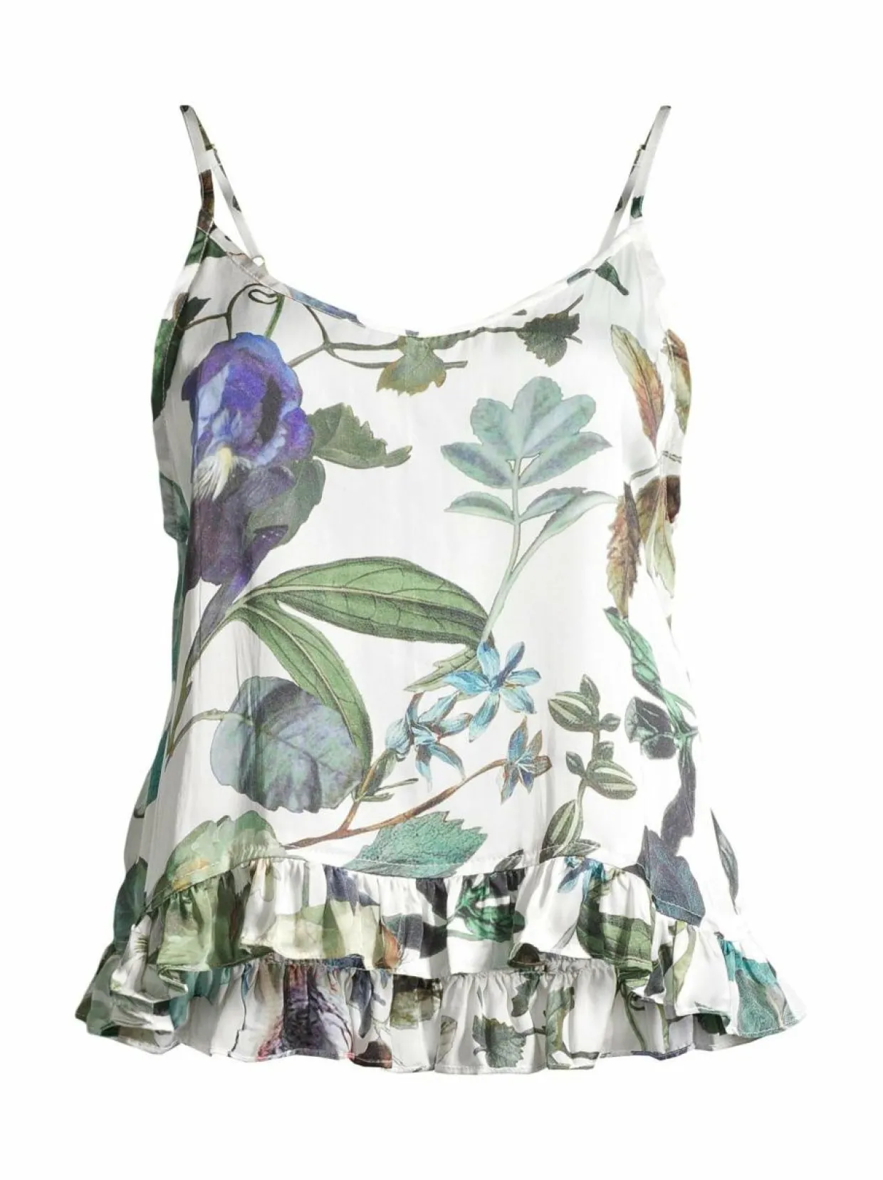 A+moren röyhelösomisteinen toppi elegantissa kukkakuosissa. Olkaimet ovat säädettävät. Selän yläosassa on joustava reunus, jonka ansiosta toppi pysyy mukavasti paikallaan. Vaate laskeutuu rennosti vartalolle ja on valmistettu silkkimäisen tuntuisesta modaalista.