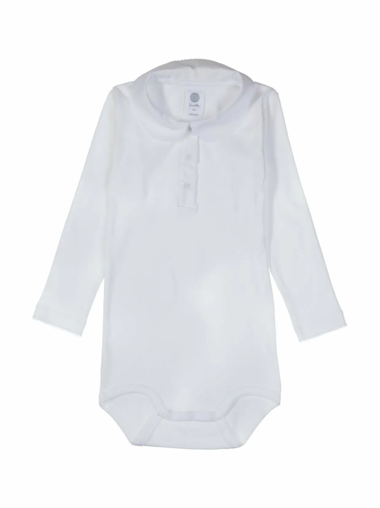 Kauluspaitamallinen body Sanetta tuotemerkiltä. Vaate on pehmeän tuntuista ja ihoystävälliseä luomupuuvillaa.
