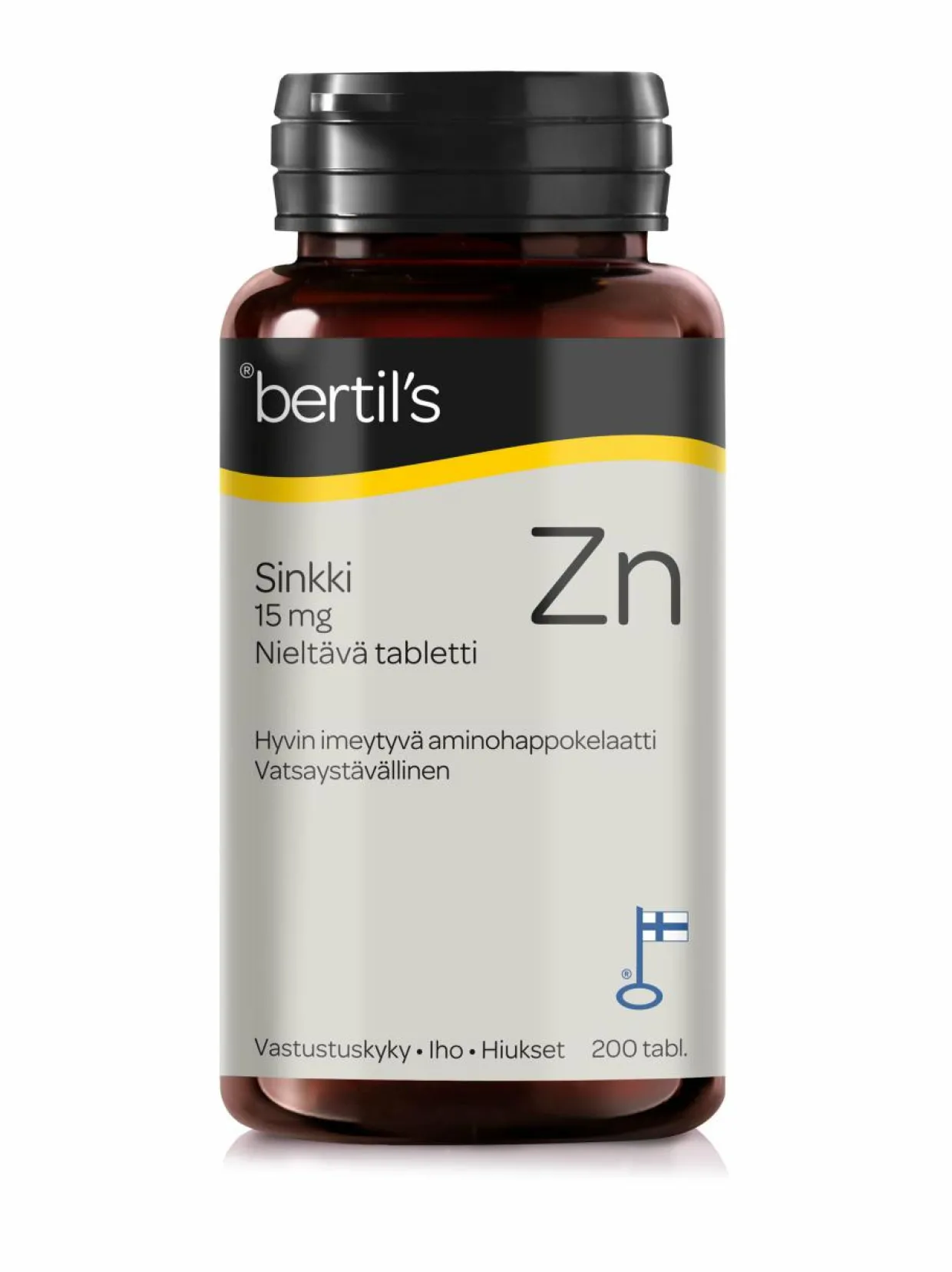 Sinkkiaminohappokelaattitabletti. Sinkki edistää vastustuskyvyn normaalia toimintaa sekä edistää ihon ja hiusten pysymistä normaalina.