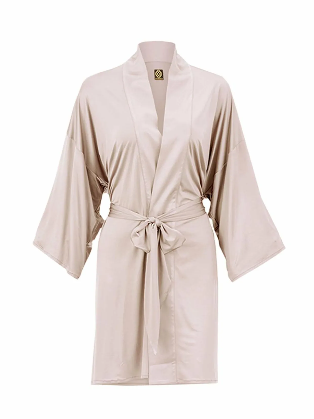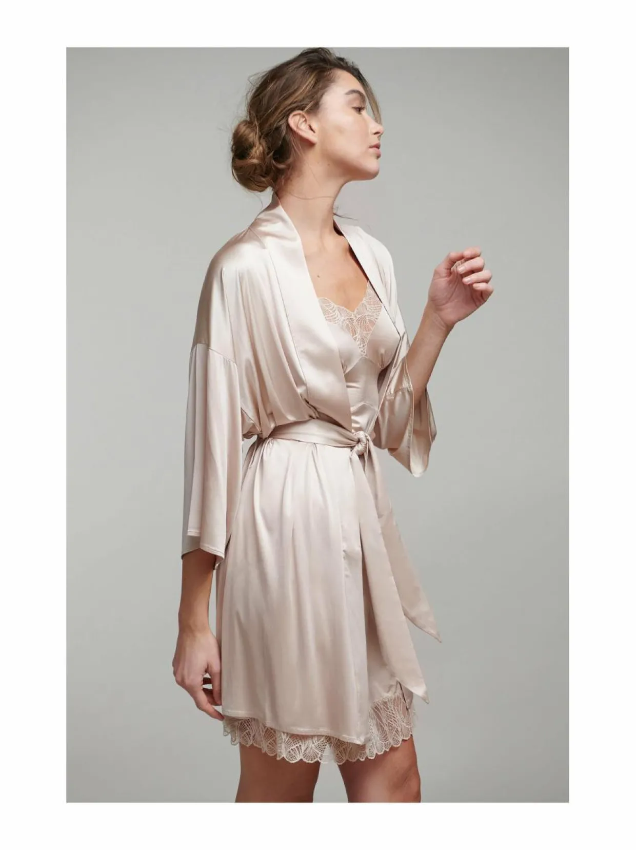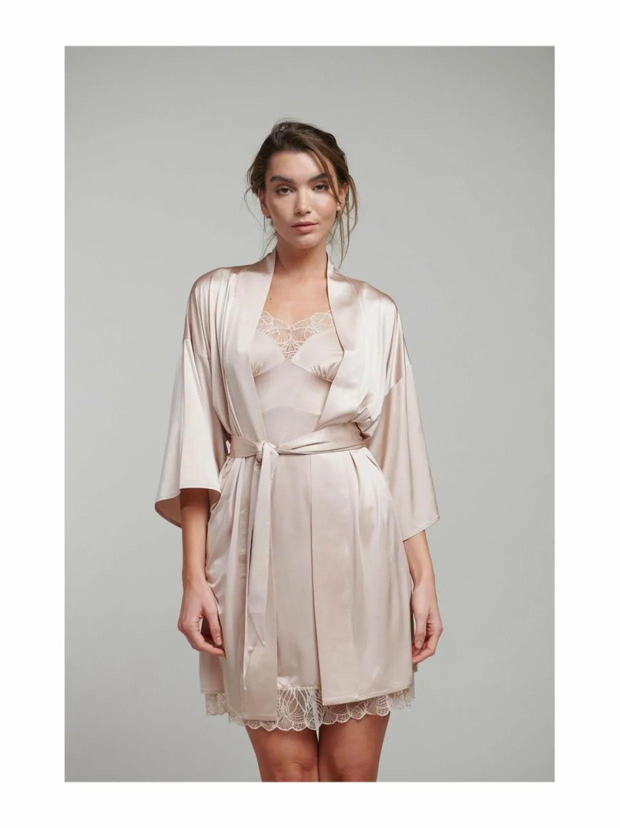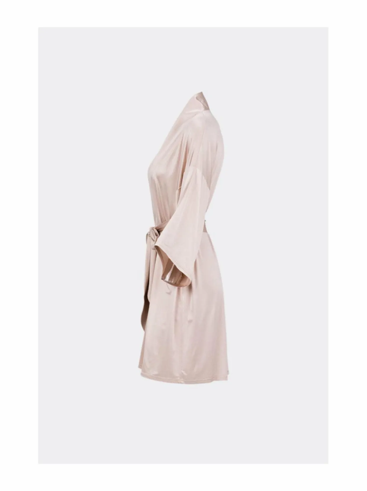 Kimonomallinen aamutakki viskoosisekoitteesta, joka antaa silkkimäisen vaikutelman. Aamutakissa leveät 3/4-hihat ja edessä on sidottava tekstiilivyö.