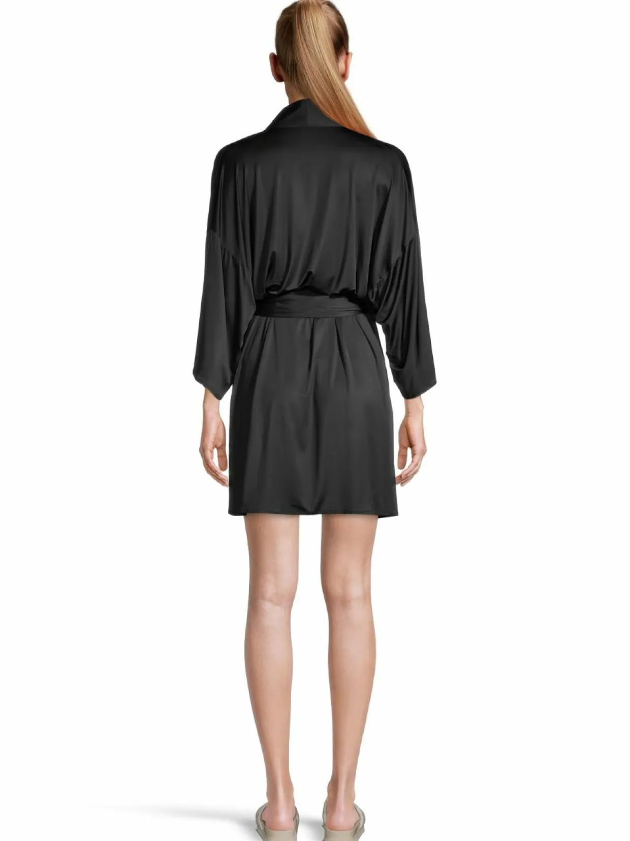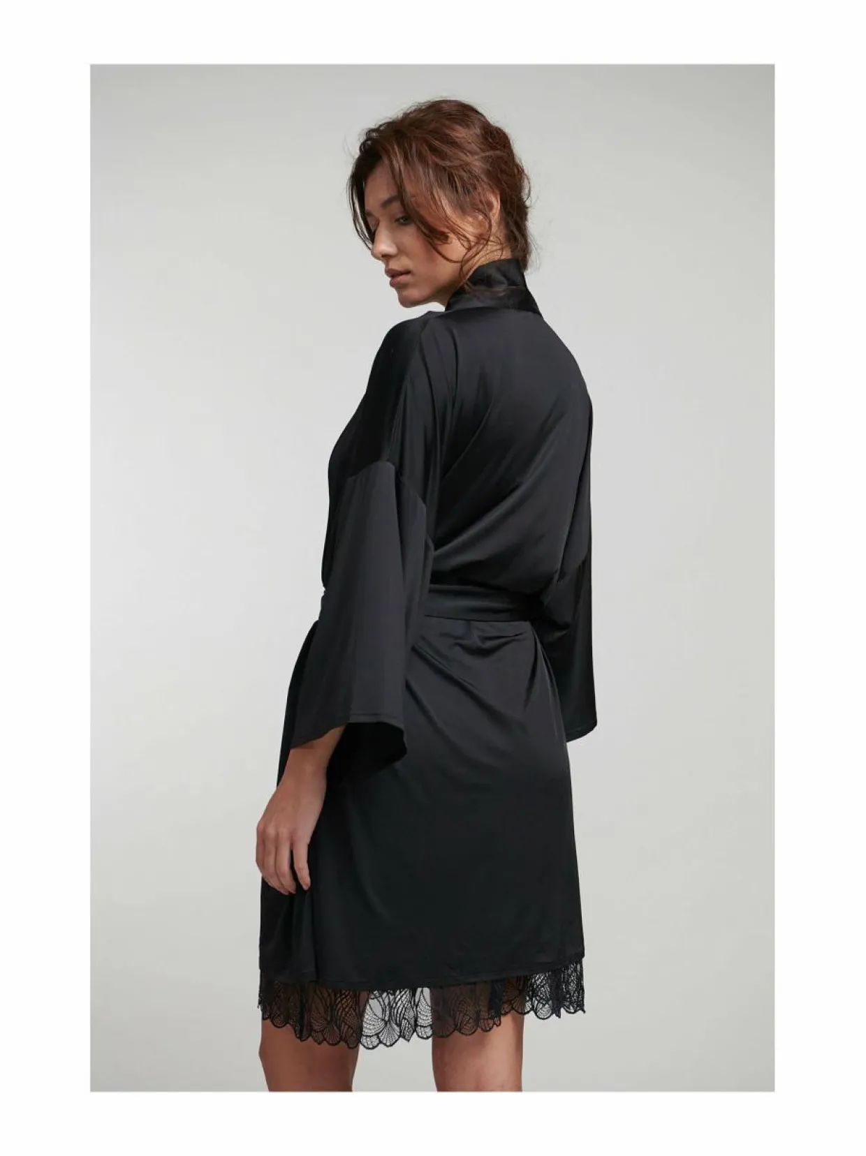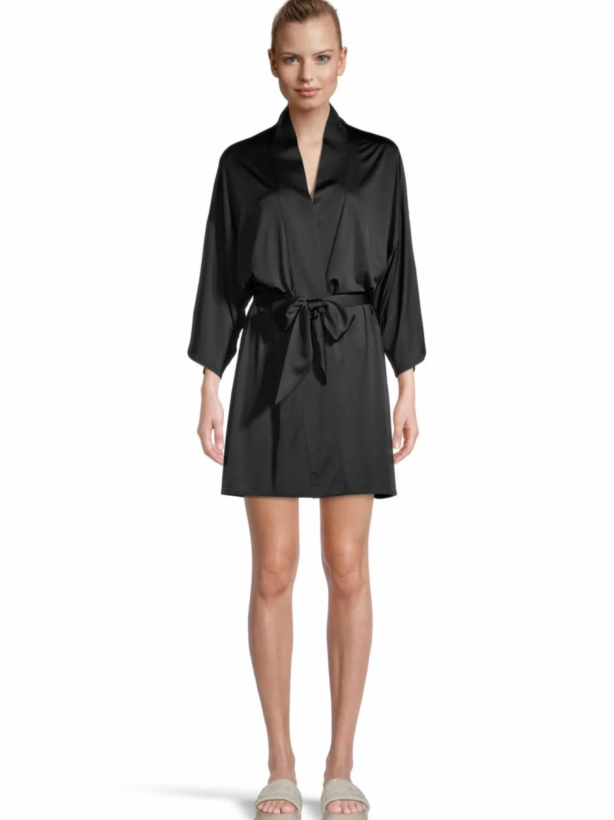 Kimonomallinen aamutakki viskoosisekoitteesta, joka antaa silkkimäisen vaikutelman. Aamutakissa leveät 3/4-hihat ja edessä on sidottava tekstiilivyö.