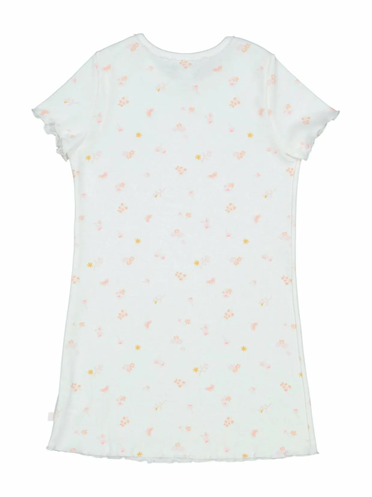 Lyhythihainen yöpaita hillityssä kukkakuosissa. Siinä on simpukkareunuksinen pyöreä pääntie, jonka keskipisteessä on pieni rusetti. Yöpaidan reunukset ovat kauniisti aaltoilevat. Materiaalina on käytetty ihoystävällistä puuvillaa.
