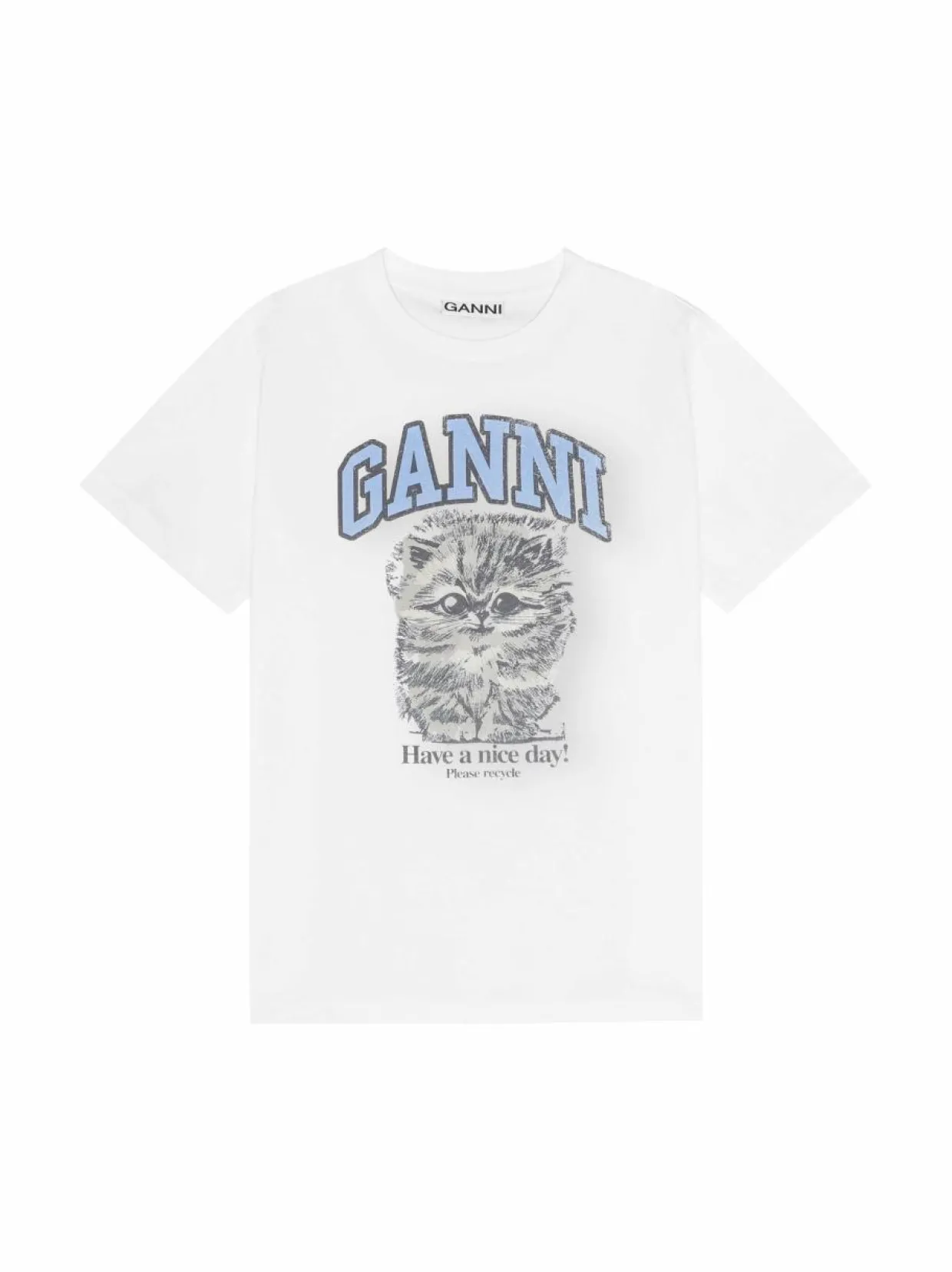 Klassinen t-paita Ganni-merkiltä. Paidan edessä on suloinen printti ja logoteksti. Tämä trikoopaita on suunniteltu rentoon istuvuuteen ja on valmistettu pehmeästä luomupuuvillaisesta trikookankaasta.