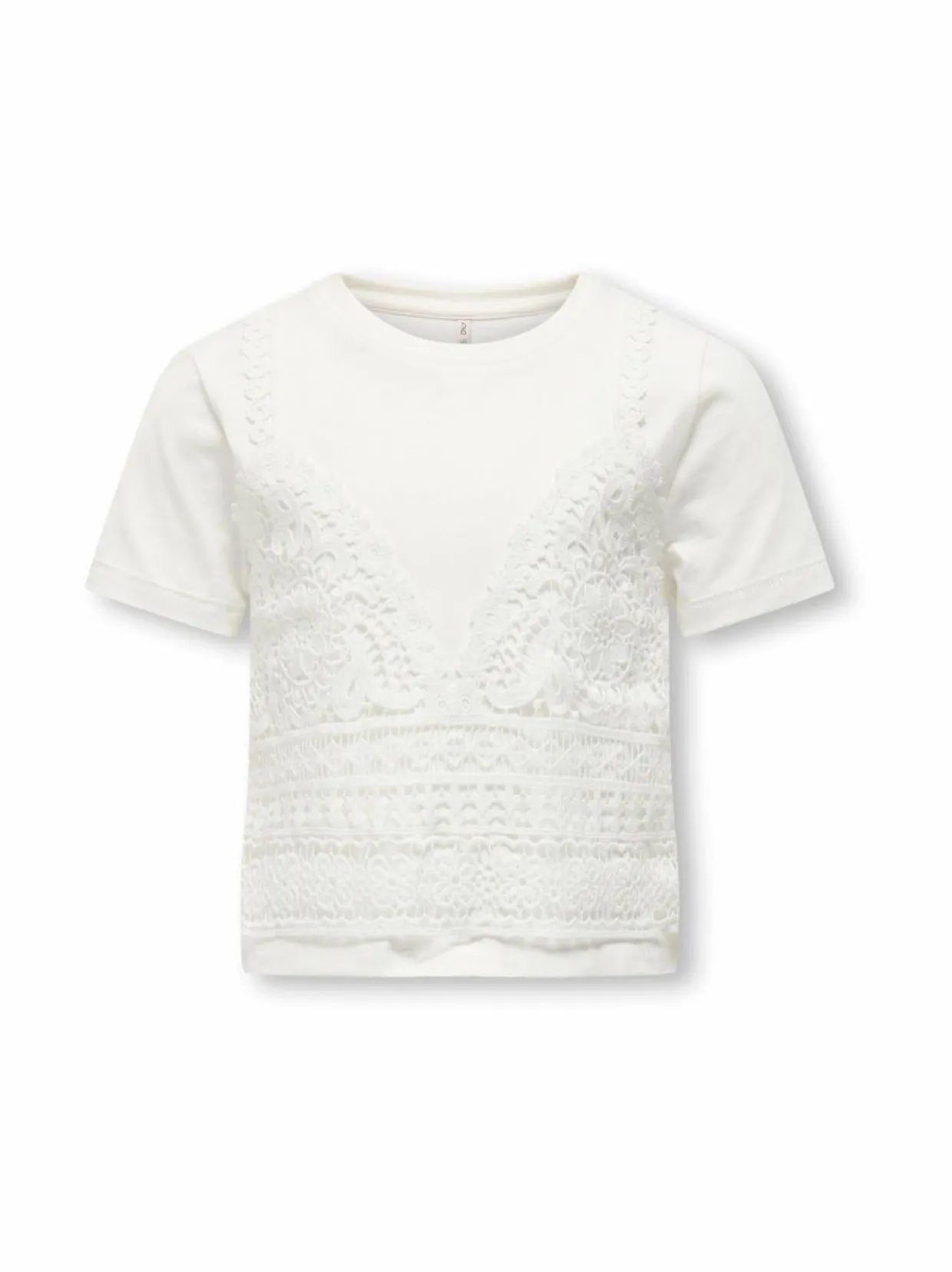 Tämä KIDS ONLY -T-paita on mainio valinta nuorekkaaseen ja mukavaan tyyliin. Se on valmistettu pehmeästä ja hengittävästä puuvillasta, mikä tuntuu miellyttävältä ihoa vasten ja takaa mukavuuden koko päiväksi. T-paidassa on pyöreä pääntie ja lyhyet hihat. Siinä on myös neulottuja yksityiskohtia, jotka lisäävät sen ainutlaatuisuutta.