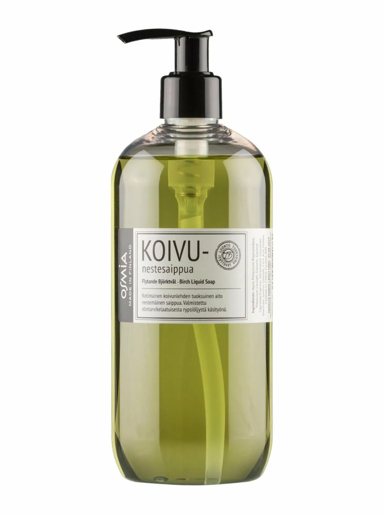 Osmian koivuntuoksuinen nestesaippua hellii ihoa ja mieltä. Aito nestesaippua on valmistettu käsityönä kookos- ja rypsiöljystä. Se vaahtoaa pehmeästi ja pesee ihanan puhtaaksi kuivattamatta ihoa.